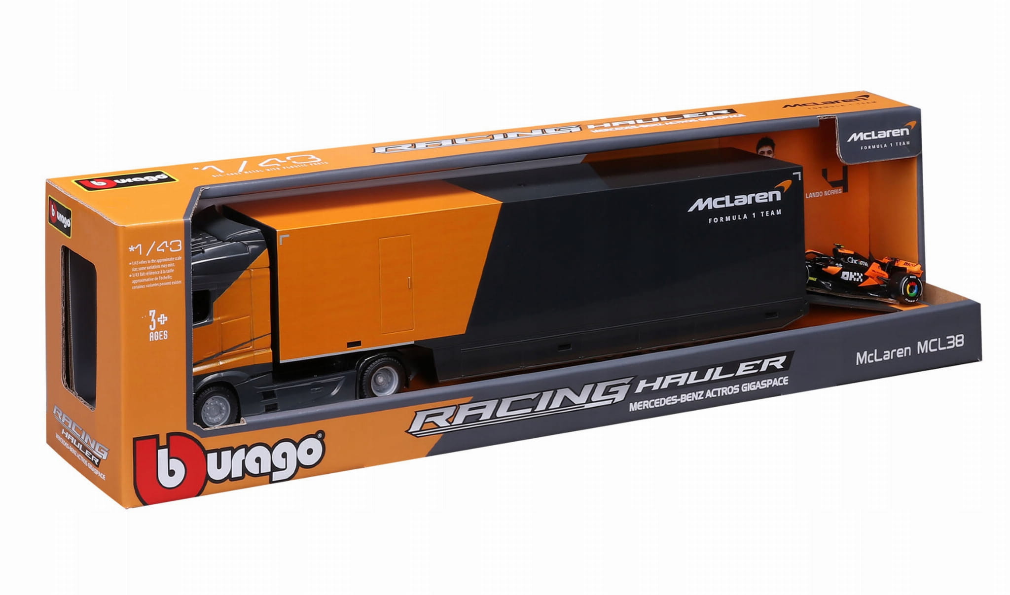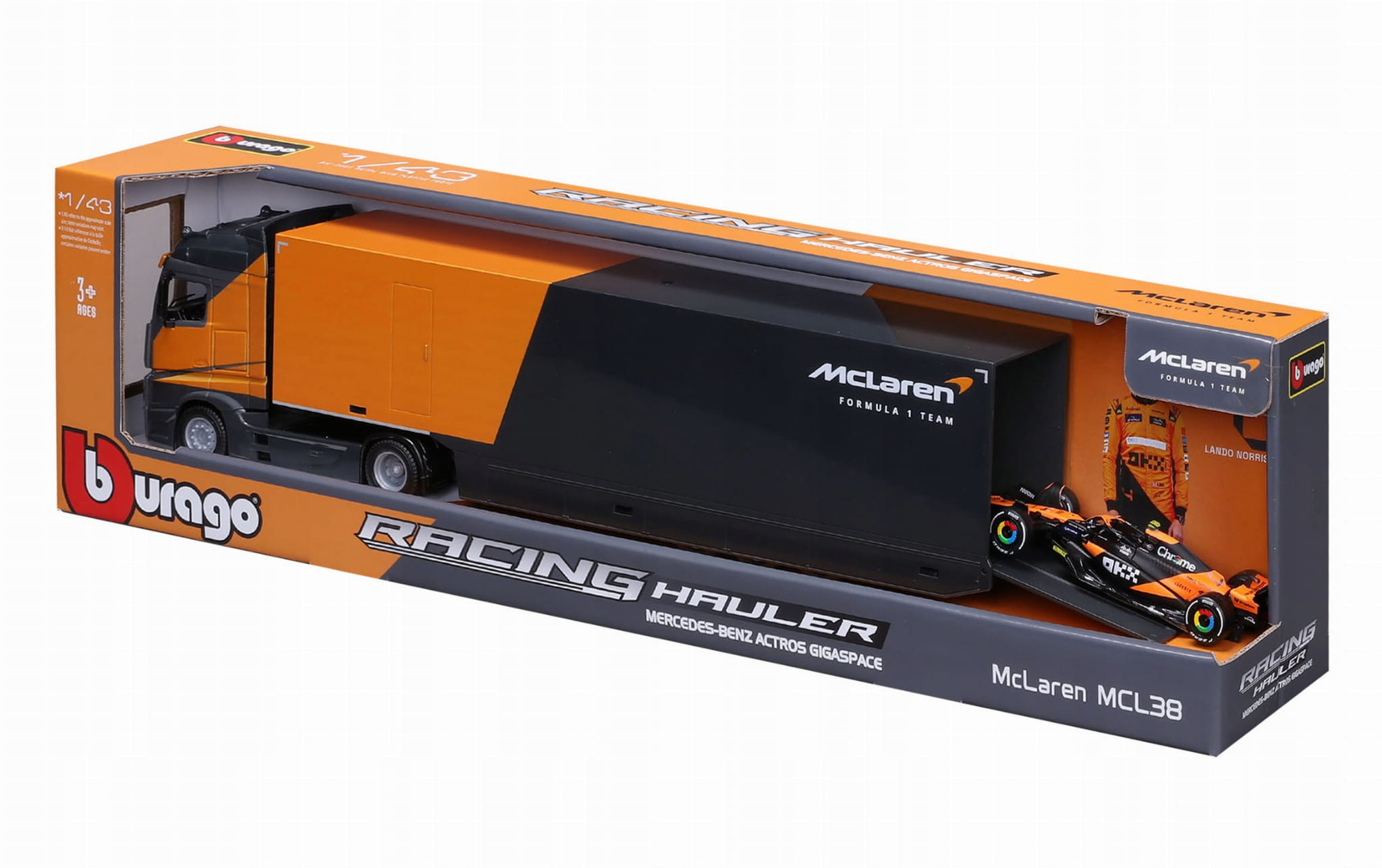 Wyjątkowy zestaw od Bburago w skali 1:43 – oficjalnie licencjonowana replika ciężarówki transportowej Mercedes-Benz Actros GigaSpace zespołu McLaren Formula 1 Team wraz z modelem bolidu wyścigowego MCL38 #4 Lando Norris.