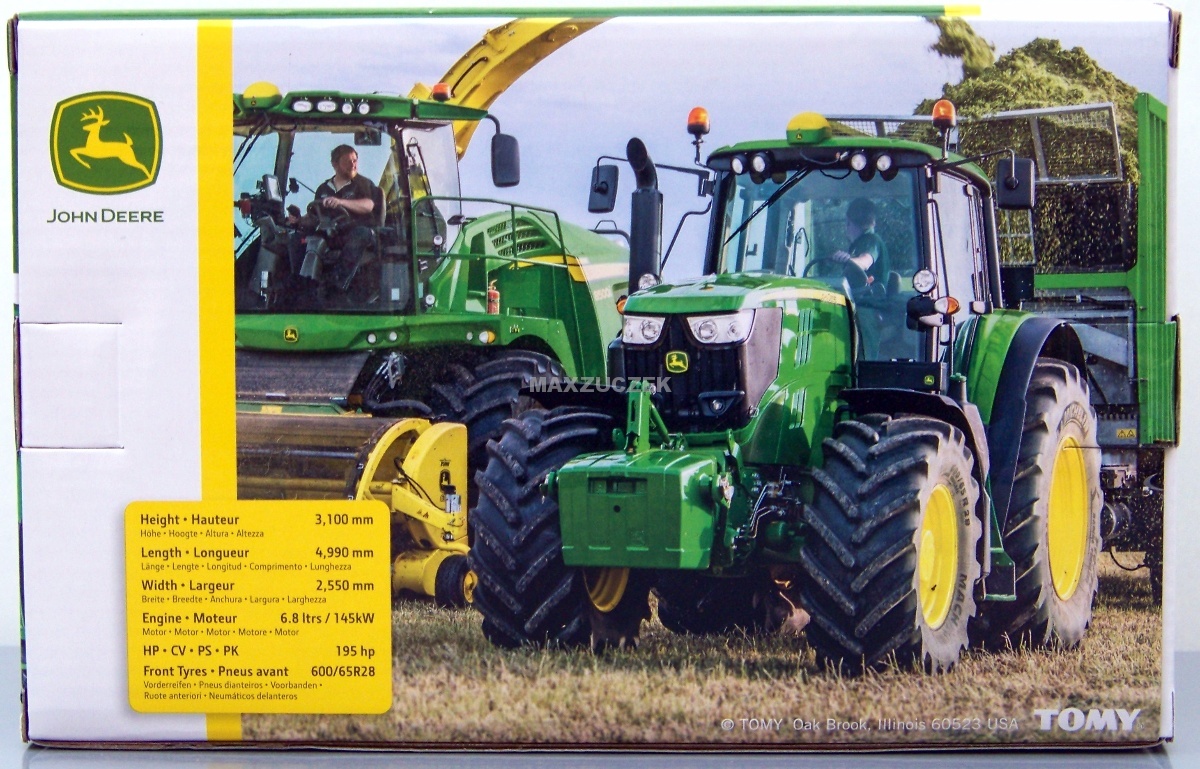 Ten ciągnik John Deere 6M w skali 1:32 wiernie odzwierciedla styl nowej generacji maszyn rolniczych firmy dzięki charakterystycznemu, eleganckiemu reflektorowi. Jest tam szczegółowa kabina traktorzysty, duże opony bieżnikowane, doskonały detal wnętrza i działająca kierownica.