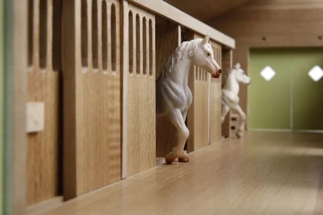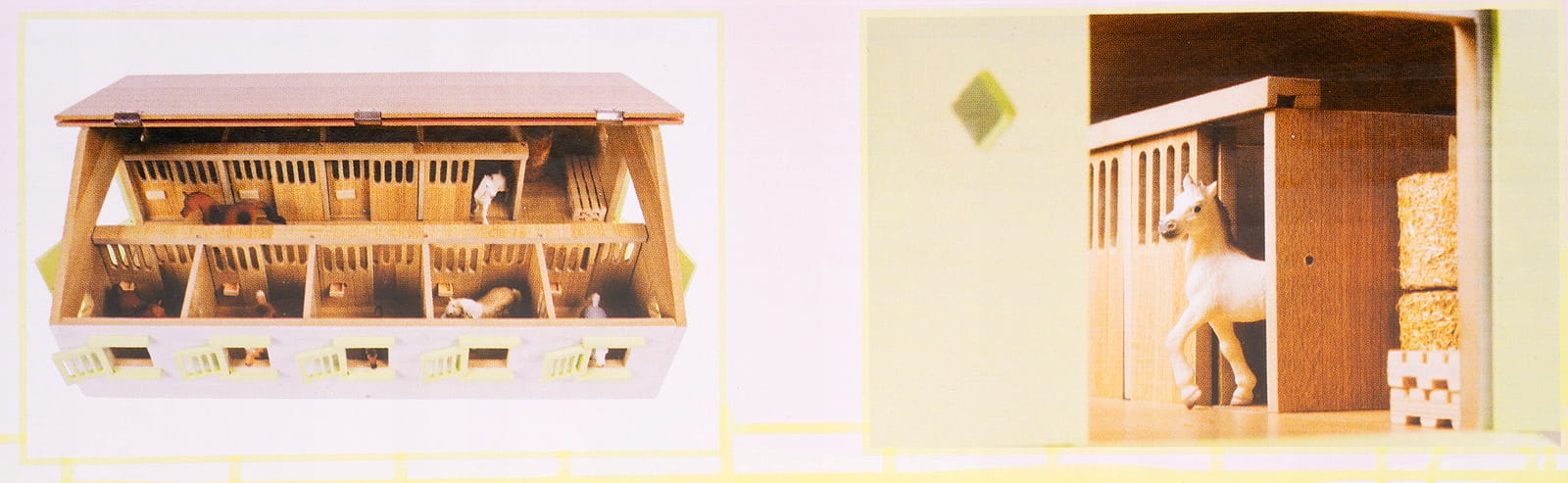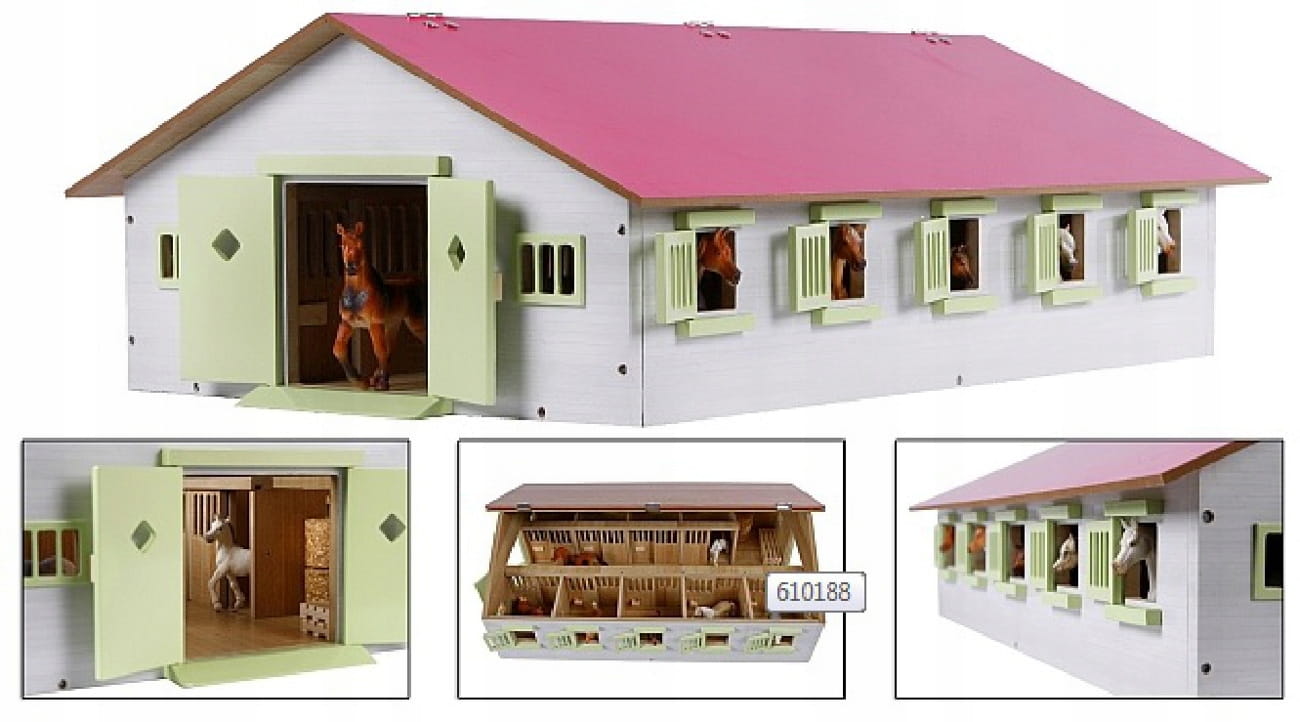 Duża drewniana stajnia wykonana została całkowicie z drewna i materiałów drewnopodobnych w skali 1:32. We wnętrzu posiada aż dziewięć boksów dla koni oraz pomieszczenie gospodarcze.
