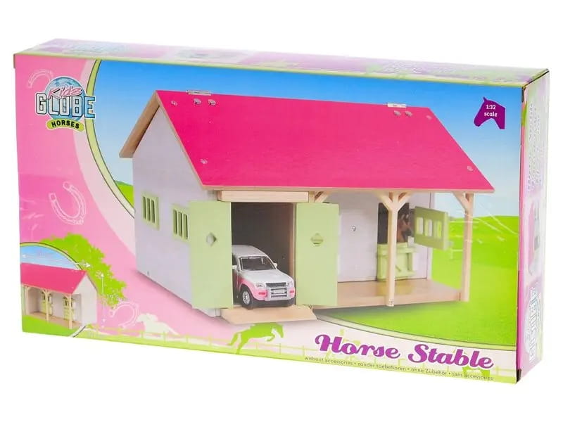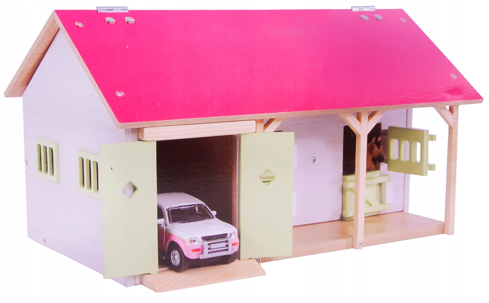Duża drewniana stajnia wykonana została całkowicie z drewna i materiałów drewnopodobnych w skali 1:32. We wnętrzu posiada 2 boksy dla koni oraz miejsce na auto lub przyczepkę.
