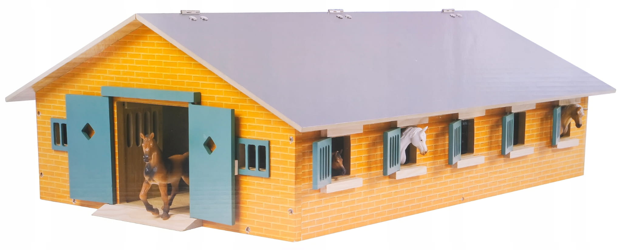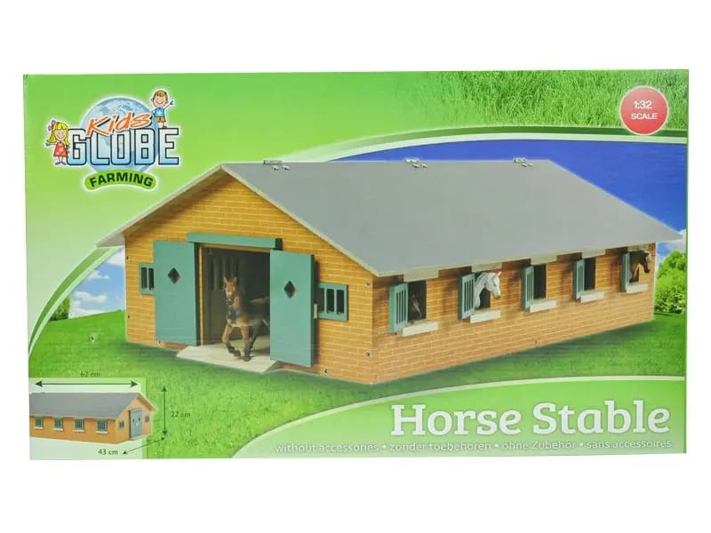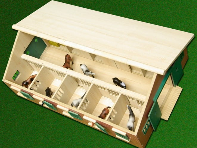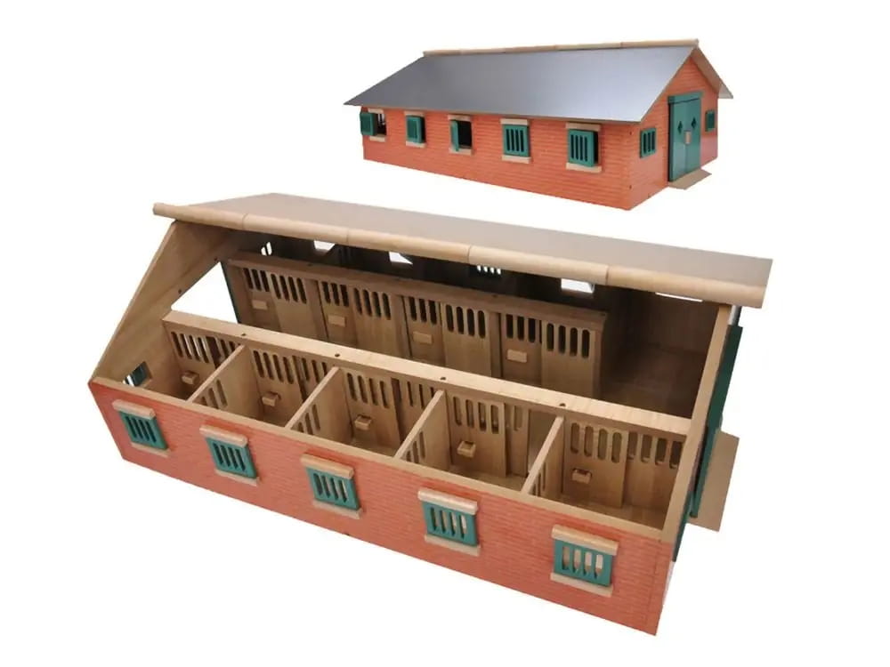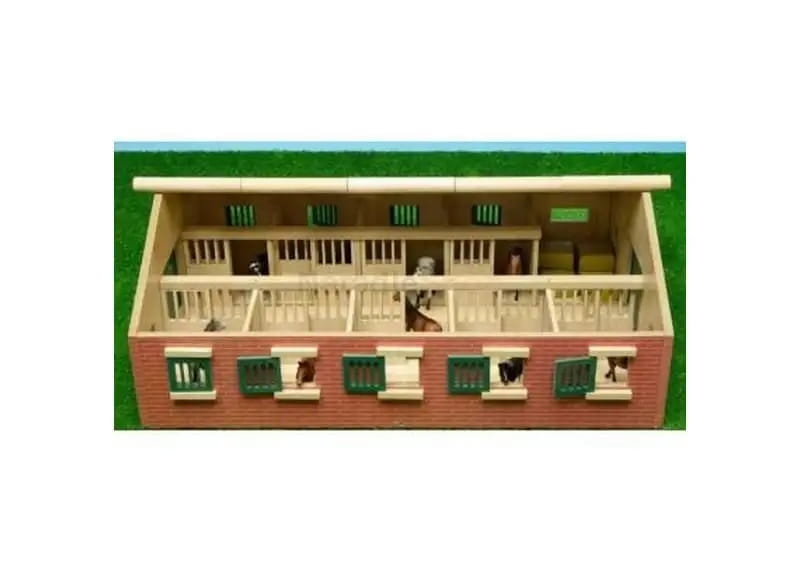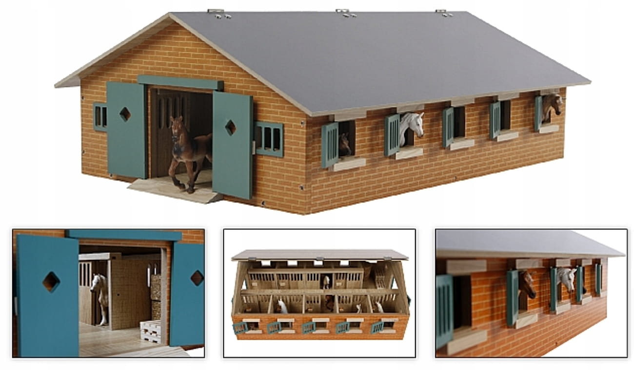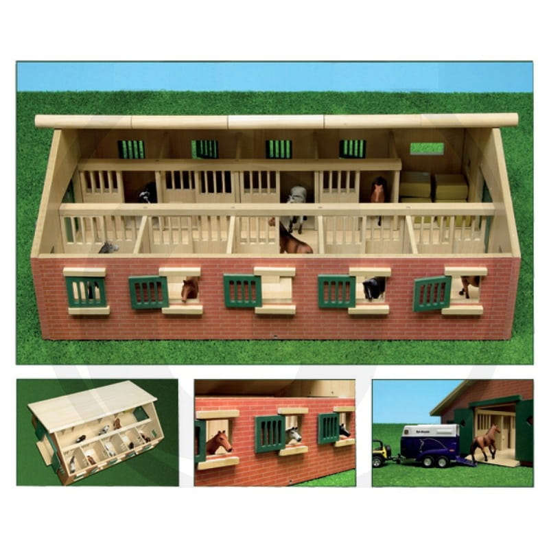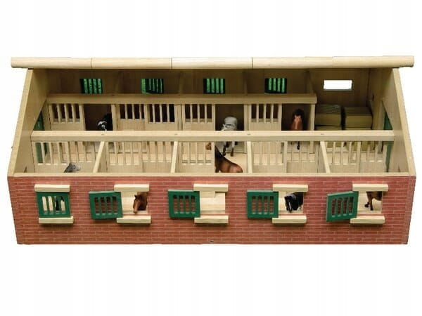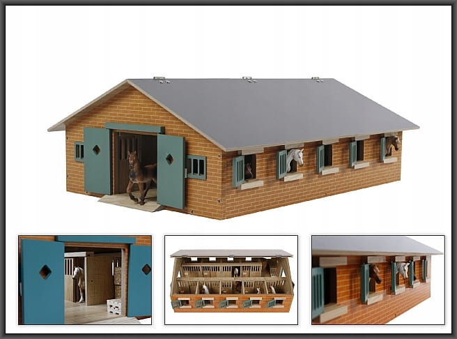 Duża drewniana stajnia wykonana została całkowicie z drewna i materiałów drewnopodobnych w skali 1:32. We wnętrzu posiada aż dziewięć boksów dla koni oraz pomieszczenie gospodarcze.