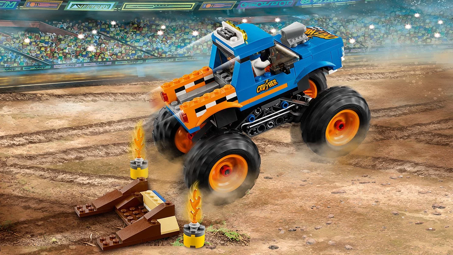 - Rozpędź monster trucka i wjedź na rampę, aby przeskoczyć nad płonącymi beczkami.