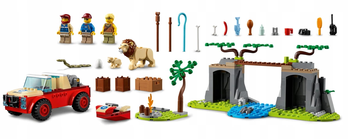 - W pudełku znajduje się wszystko, czego dzieci potrzebują do zbudowania terenówki z napędem na cztery koła, skutera wodnego i scenerii imitującej sawannę, a także minifigurki Jessiki Sharpe, strażnika i badacza oraz figurki lwicy, lwiątka i węża.