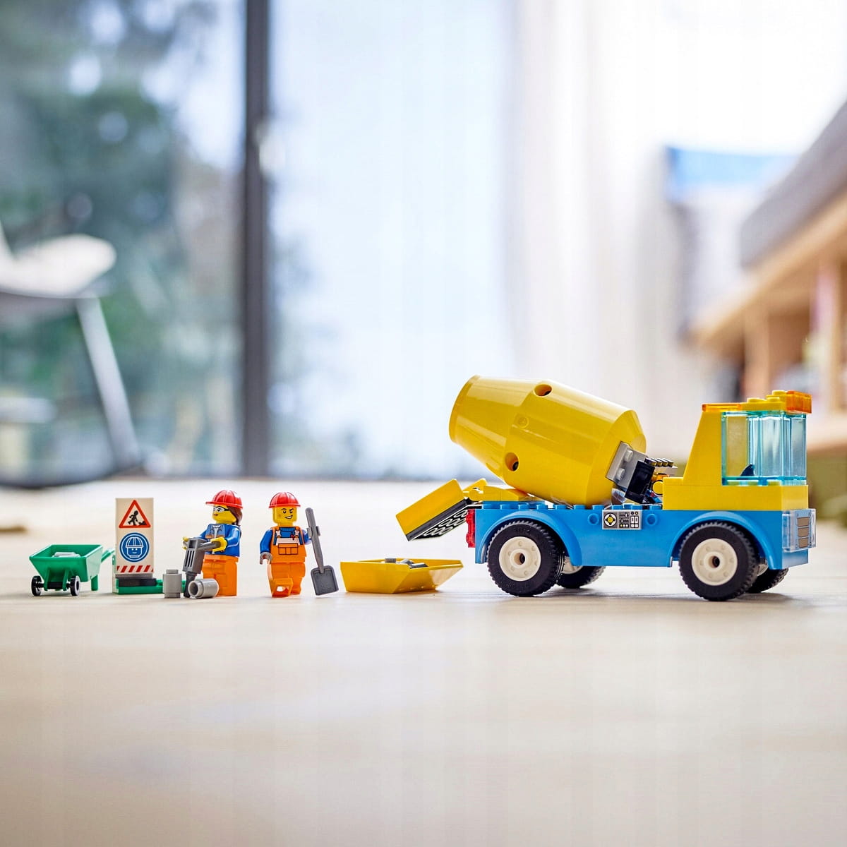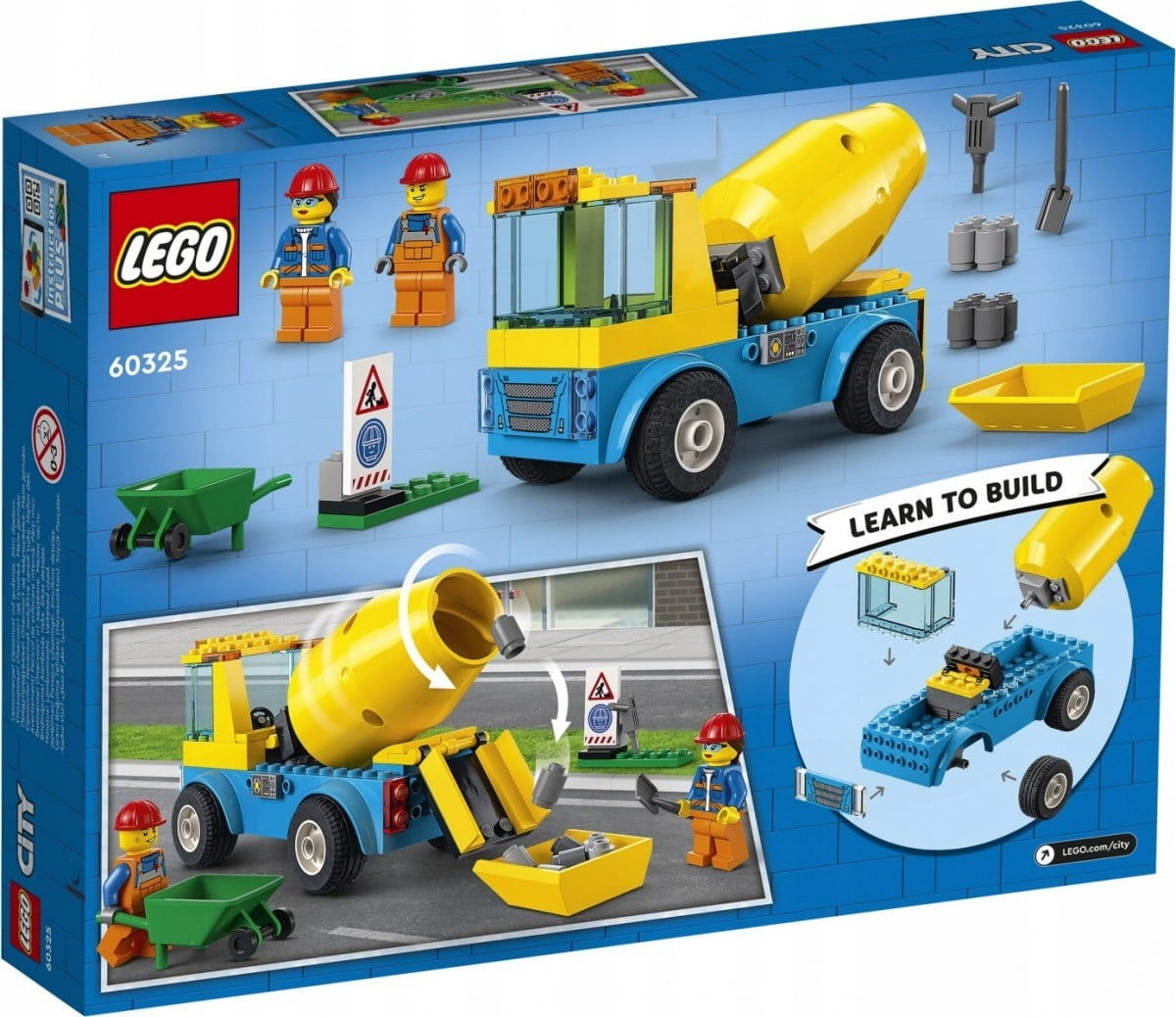 - Zawartość opakowania — w środku jest wszystko, czego dzieci potrzebują do zbudowania modelu LEGO® City Ciężarówka z betoniarką oraz taczki, młot pneumatyczny, znak ostrzegający o budowie oraz dwie mini figurki pracowników budowy