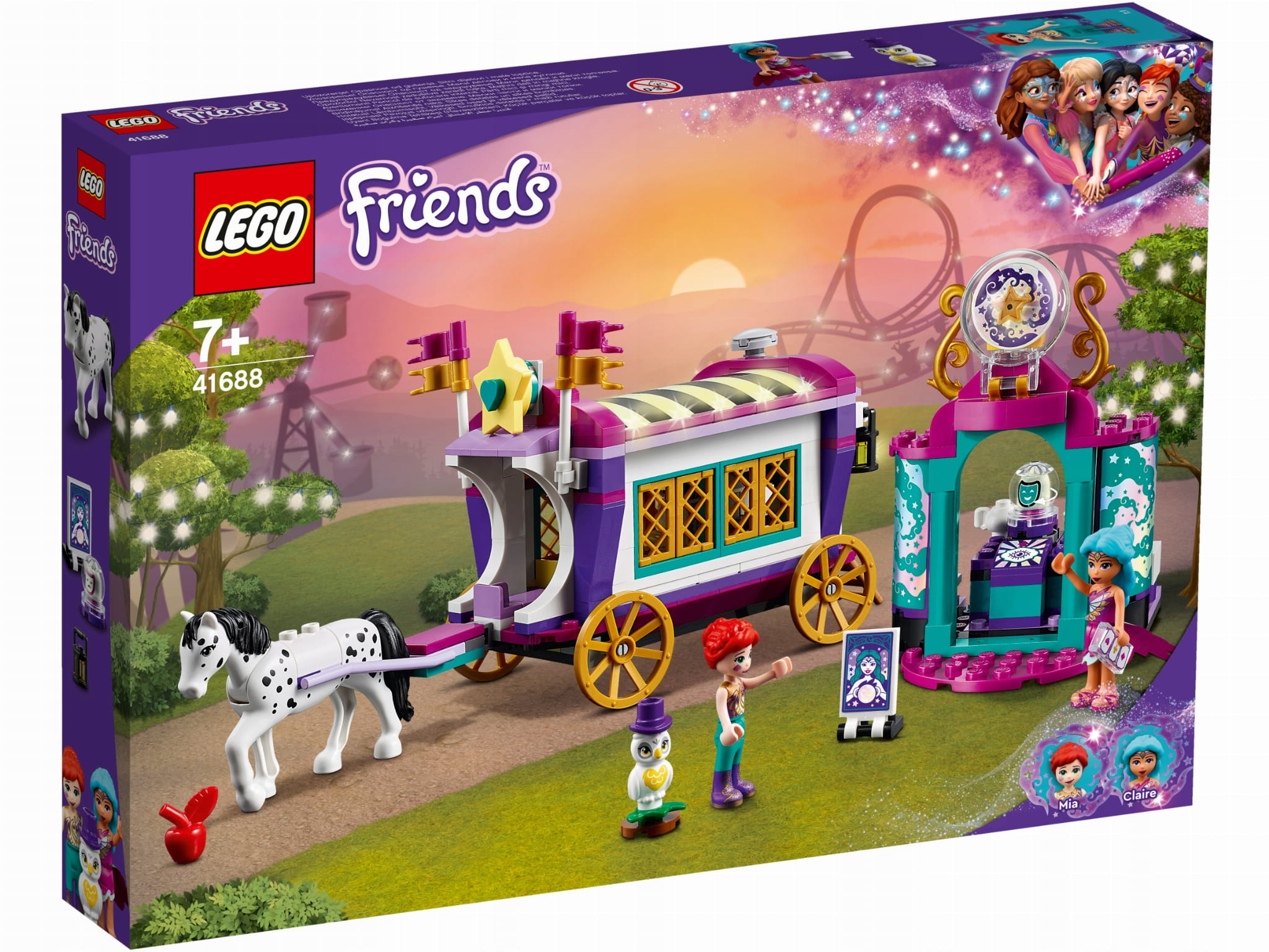 Zestaw Magiczny wóz (41688) z modelem staromodnego wozu i namiotem wróżki kryje w sobie sekrety, które dostarczą dzieciom pomysły na fascynującą zabawę i wcielanie się w role. W komplecie są dwie mini laleczki LEGO(R) Friends oraz figurki konia i sowy, a to oznacza mnóstwo możliwości kreatywnej zabawy. Przytulny wóz też jest bardzo ciekawy -- dzieci znajdą w nim piec, stolik i ukrytą toaletę. Dzieci mogą bawić się w opiekę nad koniem, rozmawiać z mądrą sową, czytać przyszłość w kryształowej kuli, a nawet jeździć zabawkowym wozem -- granicą jest wyobraźnia. W zestawie jest osobny namiot wróżki, więc dzieci mogą urządzić pokaz wróżb dla rodziny lub zabrać kryształową kulę do przyjaciół. Dzięki temu zabawa będzie jeszcze ciekawsza! Ten zestaw pęka w szwach od magii i będzie wspaniałym prezentem na święta, urodziny lub bez okazji dla każdego kreatywnego chłopca lub dziewczynki w wieku od 6 lat. Wóz ma ok. 11 cm wysokości i 24 cm długości, a namiot ma ok. 11 cm wysokości i 8 cm szerokości, co oznacza, że modele można spokojnie zmieścić nawet na niewielkiej półce. Wóz ma mnóstwo inspirujących detali i otwierany dach, który pozwala dzieciom bawić się w środku i udawać gotowanie na piecyku lub nalewanie wody do wiadra, żeby napoić konia.