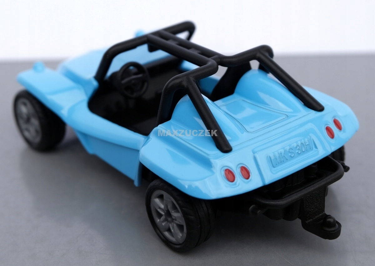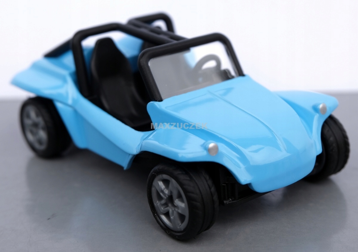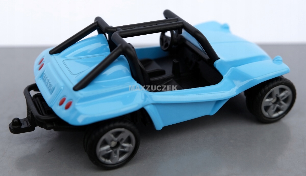 Lato, słońce i mały samochód terenowy W latach 60. i 70. było to modne i stylowe auto na wschodnim wybrzeży Ameryki. Na bazie VW garbusa powstało wiele modułowych samochodów. Dzięki lekkiej plastikowej karoserii, rezygnacji z dachu, drzwi i szyb ten samochód ze słabym silnikiem stał się pojazdem sprawiającym prawdziwą przyjemność. Tym małym samochodem terenowym firmy siku w kolorze błękitnym można wybrać się na piękną wycieczkę w hipisowskie czasy. Z gumowanymi oponami na sportowych felgach i pałąkiem bezpieczeństwa można rozpocząć podróż w czasie.