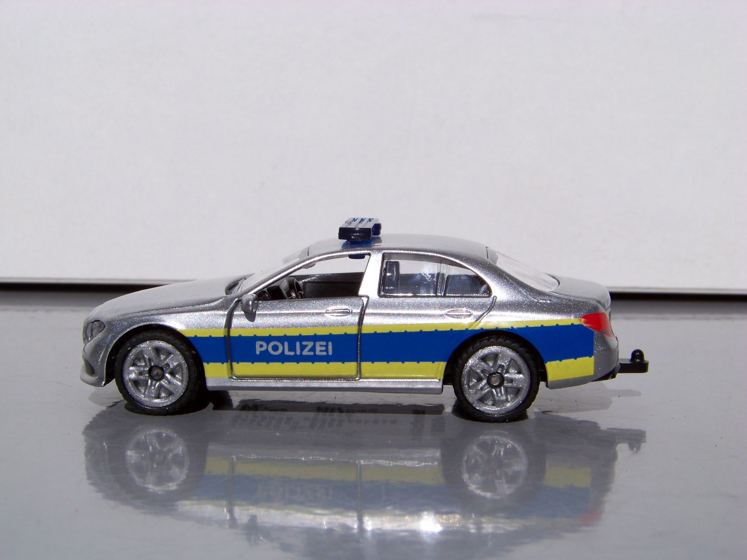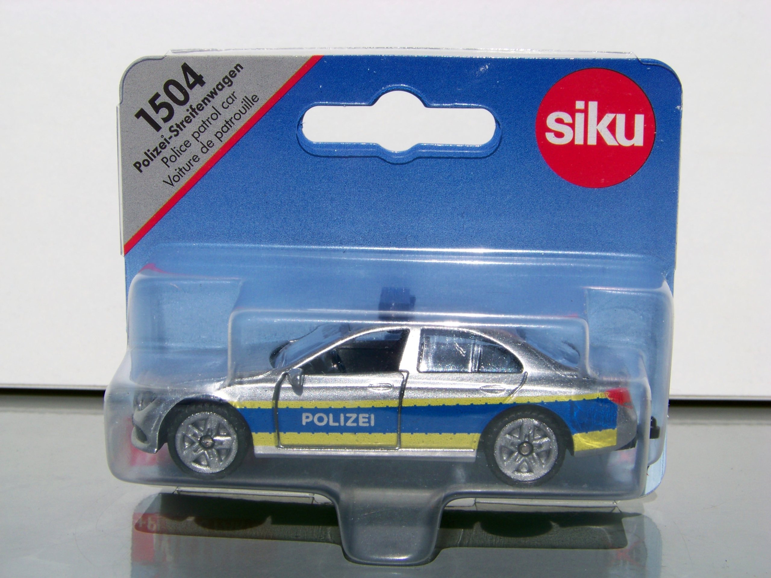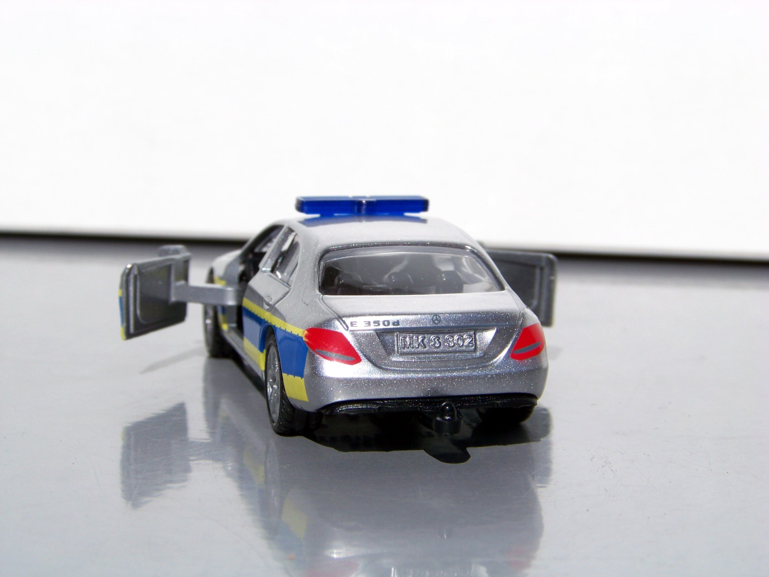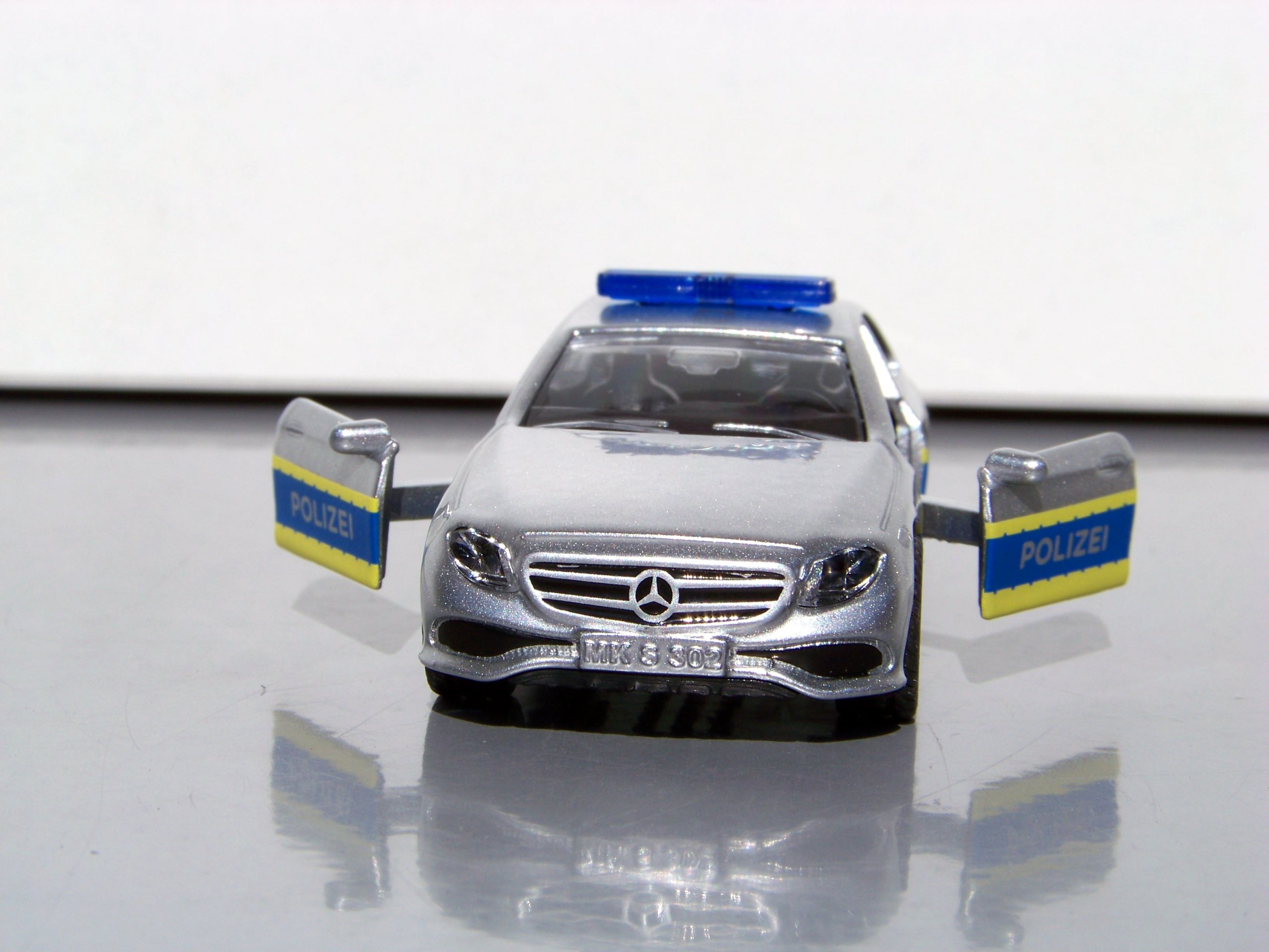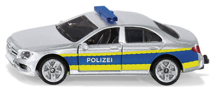 Włamanie do warsztatu SIKUWORLD! W nowym aucie Mercedes-Benz klasy E w niebiesko-żółtych barwach policyjnych policjanci depczą po piętach przestępcom. Policja może szybko ścigać uciekające pojazdy dzięki dużej mocy, sportowemu zawieszeniu i szerokim oponom trakcyjnym. Podczas większych akcji załoga tego radiowozu może być wspierana przez policjantów poruszających się następującymi pojazdami: SIKU Policja van (1350) SIKU Policja autobus (0804), SIKU Radiowóz (1401), Porsche 911 Policja autostradowa (1528)