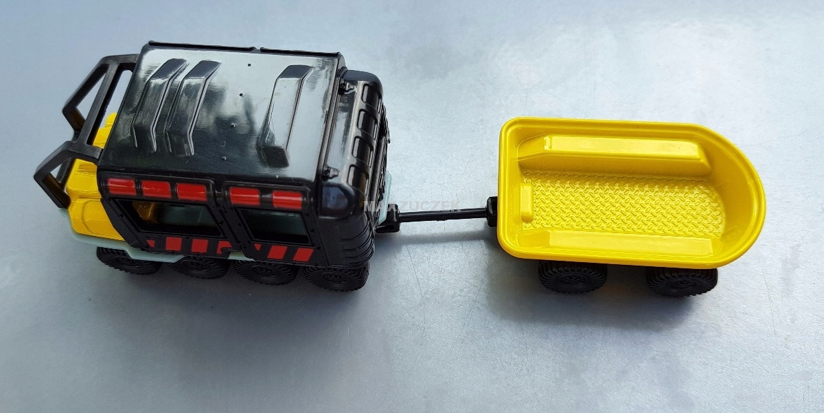 - PRZYBLIŻONE WYMIARY ZABAWKI: dł całego zestawu 15 cm, dł samego auta 7,3 cm x wys auta 4,3 cm , dł przyczepki mierzona razem z zaczepem 7,5 cm x wys przyczepki 4,3 cm