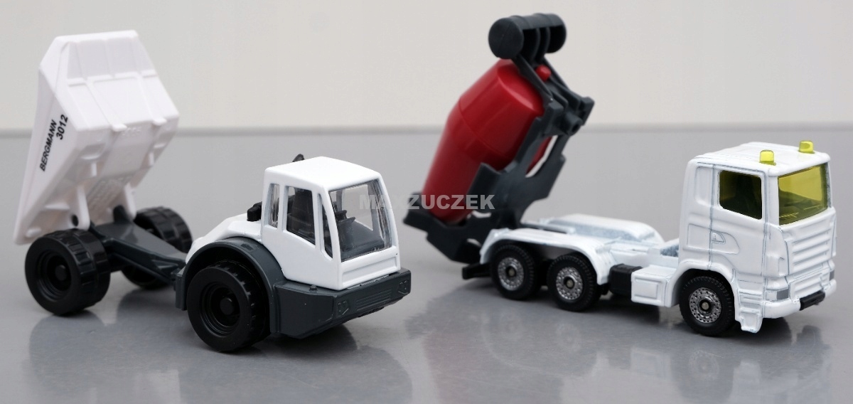 Na budowach panuje duży ruch. Wywrotka siku wysypuje ziemię z dużej koleby. Betoniarka z dużym obracającym się bębnem czeka już na rozładunek. Betoniarka siku z kabiną i podwoziem z metalu nadaje się nawet do trudnych zadań na budowie.