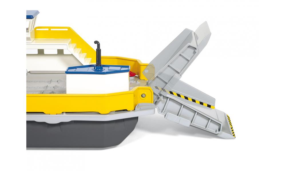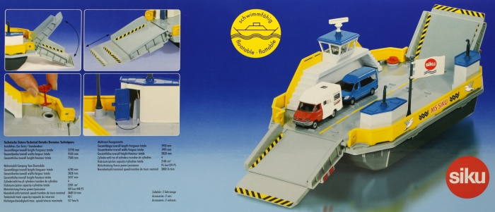 Plastikowy model promu, którym Twoje modele SIKU przekroczą każdą rzekę. Prom może pomieścić 6 samochodów osobowych lub 2 ciężarówki. Dwie opuszczane rampy ułatwiają załadunek samochodów na prom. Do promu dołączone są dwa modele samochodów.