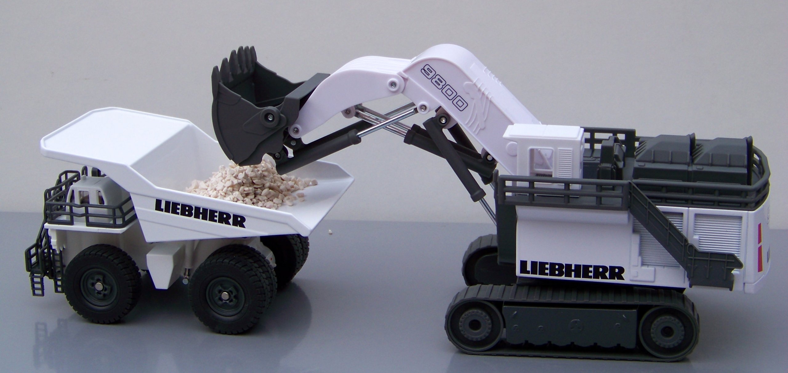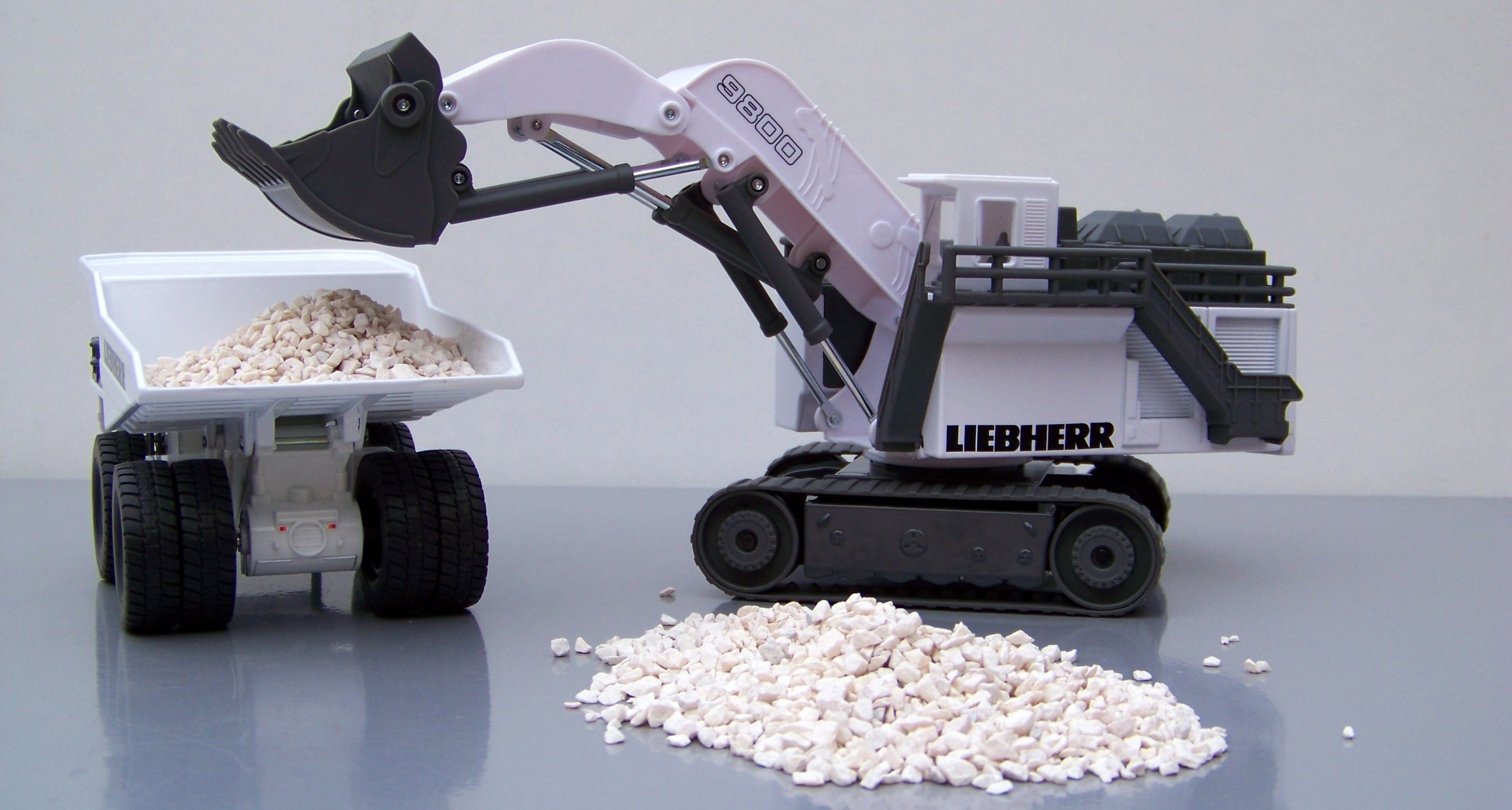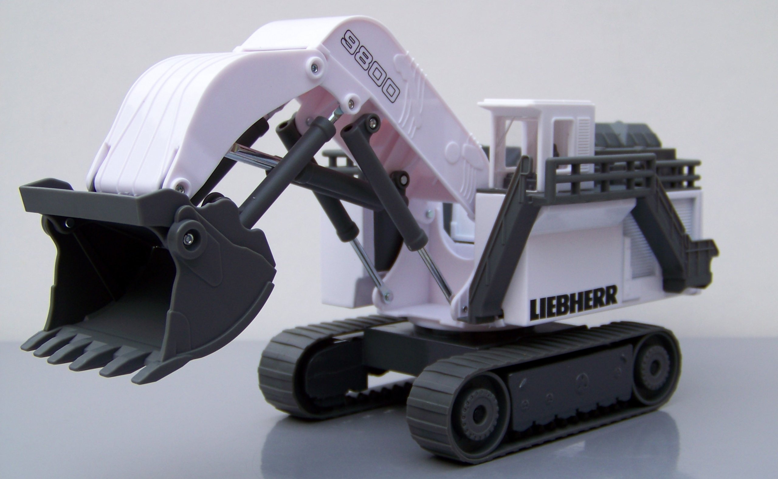 Ten olbrzym wśród koparek gąsienicowych na placach budowy i w kopalniach odkrywkowych nawet w skali H0 jest prawdziwym kolosem. Urządzenia najnowocześniejszej serii R9800 marki Liebherr należą do największych i cechujących się największą mocą koparek na świecie. Transport wykonanego niemal w całości z metalu modelu z miejsca na miejsce zapewniają dwie szerokie gąsienice. Ogromne ramię z ruchomą łyżką jest całkowicie funkcjonalne: w mgnieniu oka załaduje mini-wywrotkę do pełna. Ten wyjątkowy model uzupełnia dopracowana kabina operatora i służące do wchodzenia drabinki.