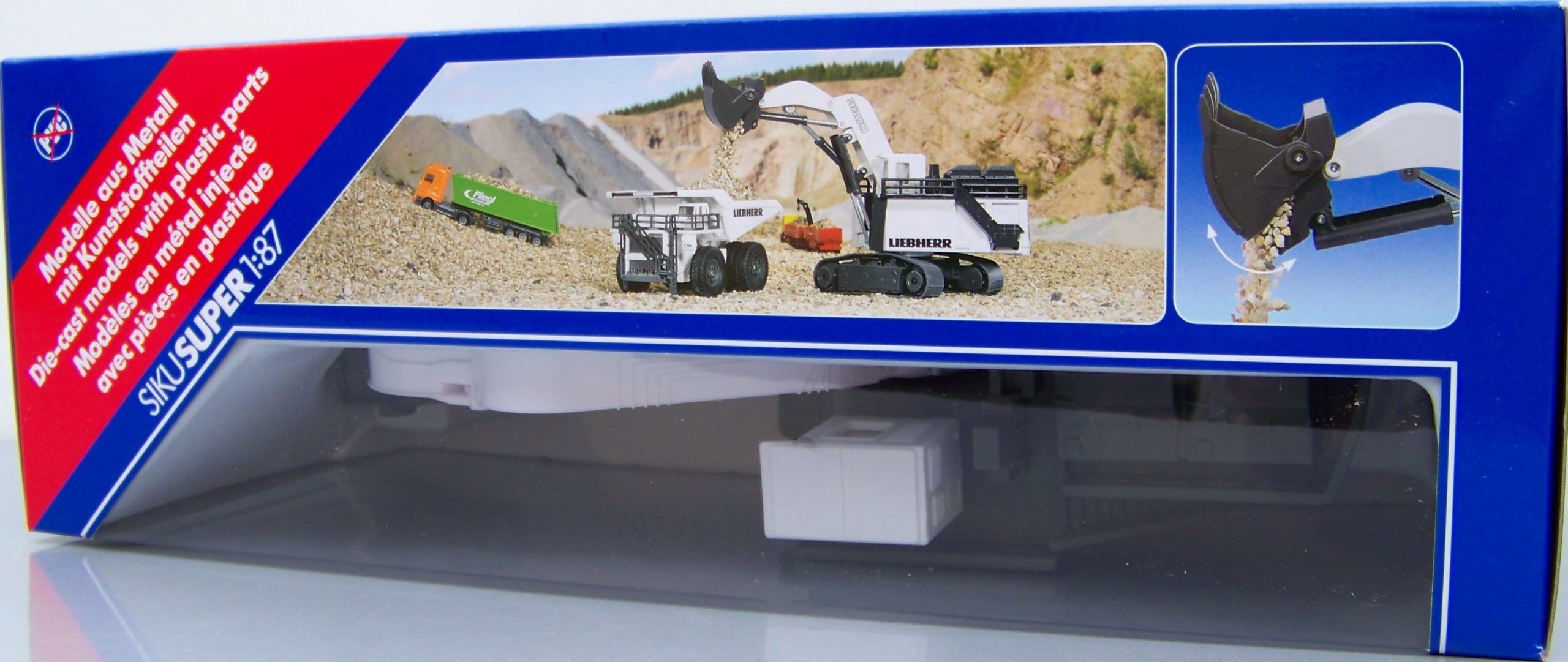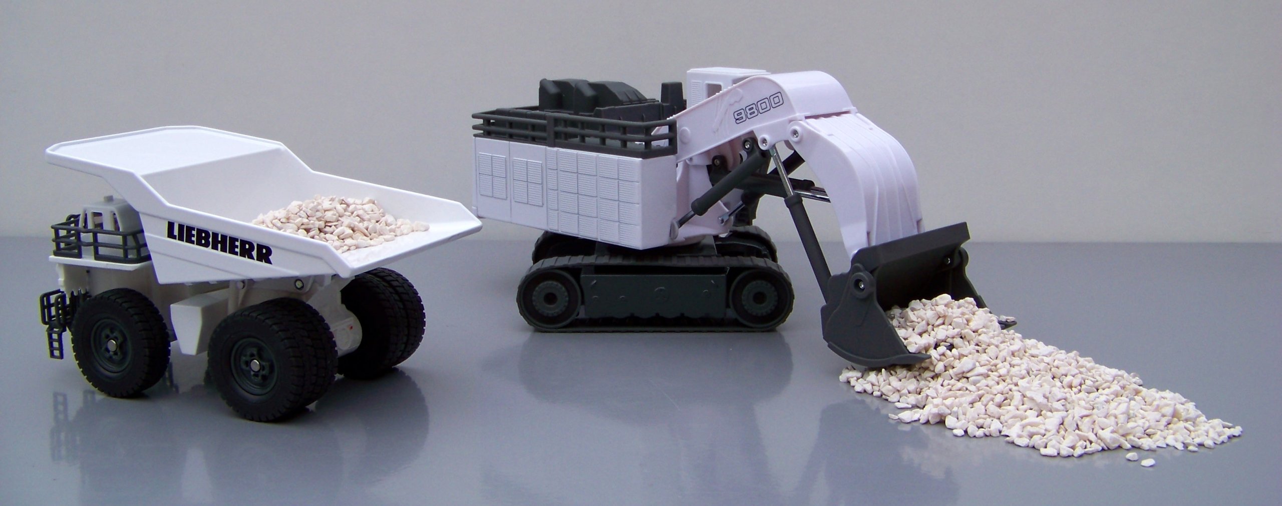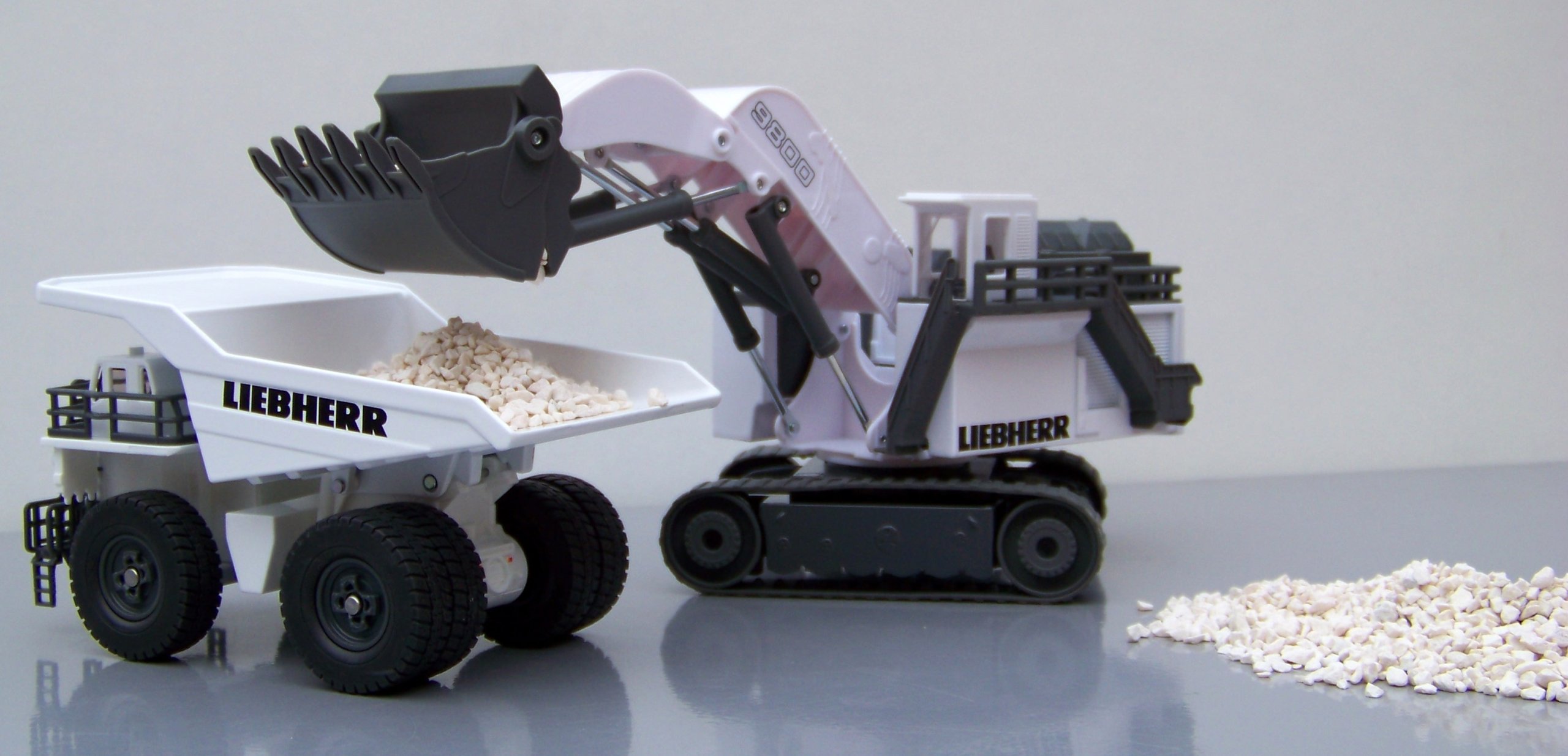 Ten olbrzym wśród koparek gąsienicowych na placach budowy i w kopalniach odkrywkowych nawet w skali H0 jest prawdziwym kolosem. Urządzenia najnowocześniejszej serii R9800 marki Liebherr należą do największych i cechujących się największą mocą koparek na świecie. Transport wykonanego niemal w całości z metalu modelu z miejsca na miejsce zapewniają dwie szerokie gąsienice. Ogromne ramię z ruchomą łyżką jest całkowicie funkcjonalne: w mgnieniu oka załaduje mini-wywrotkę do pełna. Ten wyjątkowy model uzupełnia dopracowana kabina operatora i służące do wchodzenia drabinki.