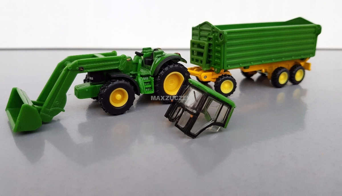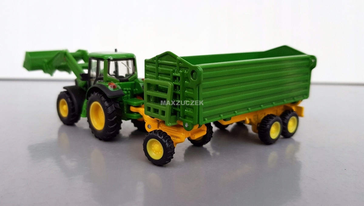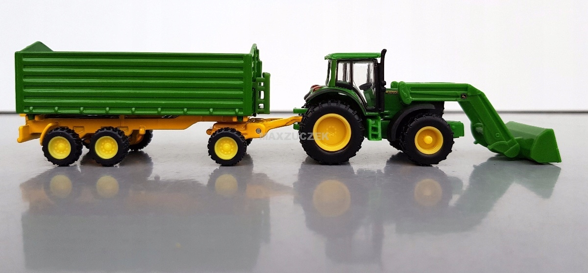 Model traktora marki John Deere wykonany w skali 1:87 z zachowaniem szczegółów pojazdu rzeczywistego. Wyposażony w ruchomą ładowarkę przystosowaną do podnoszenia drobnych przedmiotów, zdejmowaną kabinę i ruchomą przyczepę umożliwiającą transport i wyładunek. Obrotowe koła i gumowe opony umożliwiają poruszanie się po różnych powierzchniach. Model jest atrakcyjną zabawką dla najmłodszych i elementem ciekawych kolekcji.