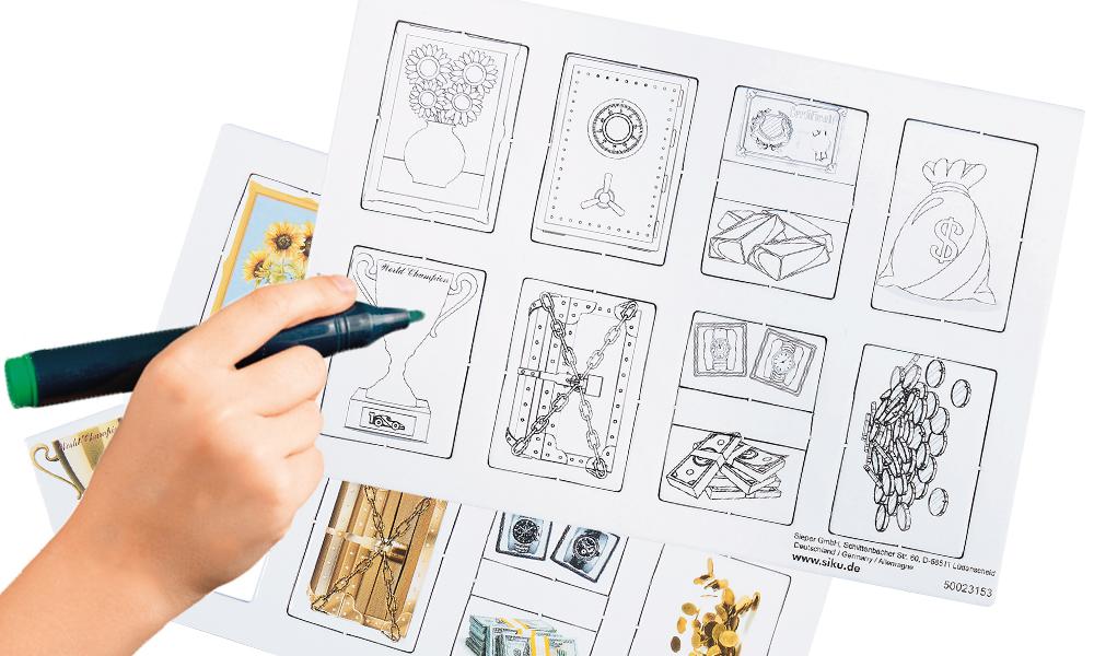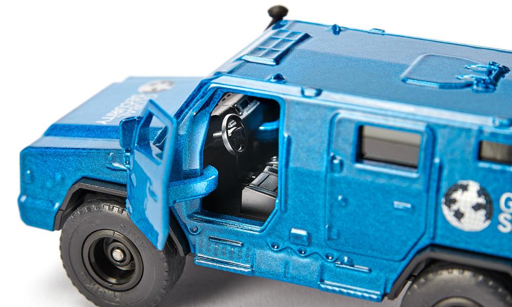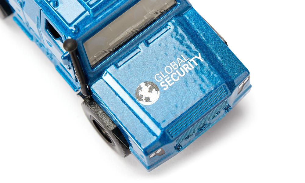 Opancerzona stalowa kabina, potężne podwozie ciężarówki 4 × 4 i najnowsza technologia – transporter pieniędzy Rheinmetall Survivor to wyjątkowy pojazd w swojej klasie. W końcu jest przeznaczony do zadań specjalnych i przewozu szczególnie cennych lub wrażliwych ładunków. Banknoty, biżuteria, cenne dzieła sztuki czy wrażliwe dokumenty – ekskluzywny ładunek jest w 100% chroniony w pancernej stalowej kabinie. Transporter pieniędzy od Siku jest w dyskretnym niebieskim, metalicznym kolorze, a na jego bokach widnieje logo „Global Security”. Drzwi po obu stronach i z tyłu są otwierane. Za pomocą dołączonych naklejek na pojeździe można umieścić dodatkowe informacje w różnych językach: „Transport pieniędzy i kosztowności” lub „System monitorowania GPS”. Dla zapewnienia szczególnie realistycznej zabawy zestaw zawiera również cztery małe sztabki złota i cztery tekturowe arkusze z dodatkowymi elementami. Przedstawiają one różne ładunki, takie jak worki na pieniądze, kasetki, obrazy lub certyfikaty, które można schować w transporterze. I jest coś ekstra: na dwóch arkuszach są nadrukowane tylko kontury, dzięki czemu poszczególne elementy można pokolorować i twórczo zaaranżować.