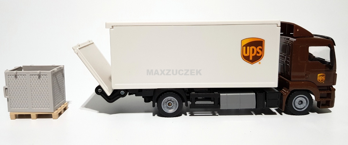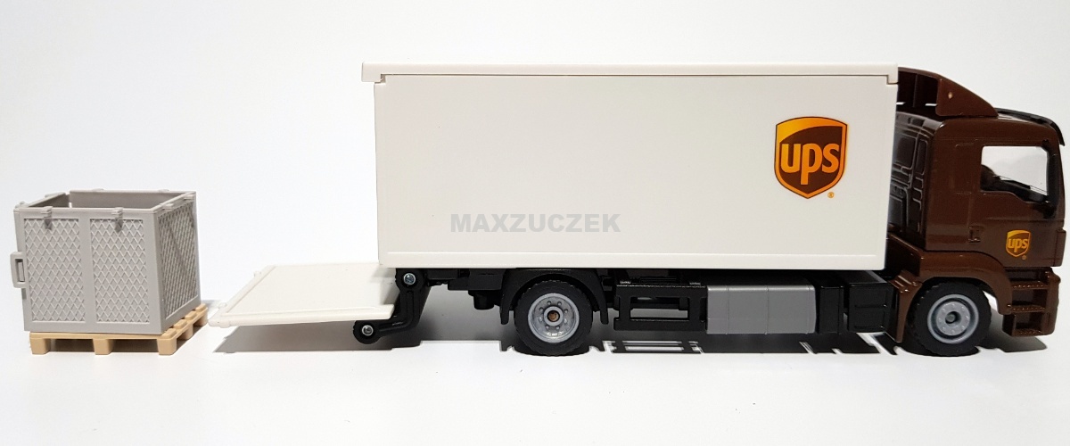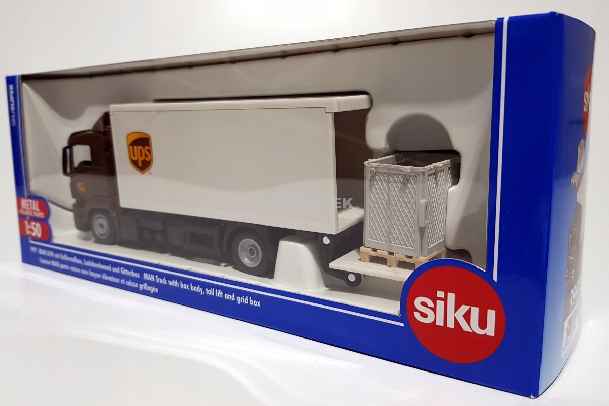 Szybkie dostarczanie drobnicy do wielu miejsc rozładunku. Takie zadanie ma ciężarówka MAN w stylu UPS. Obszerne nadwozie furgonowe i burta rozładunkowa ułatwiają rozładunek. W pojeździe siku wykonanym w skali 1:50 burtę rozładunkową można opuszczać do pozycji pionowej, jak w oryginale. Z paletą i skrzynią siatkową pokój dziecięcy stanie się centrum transportowym.