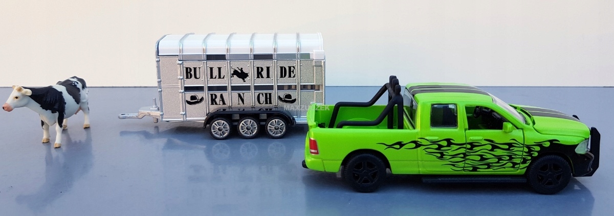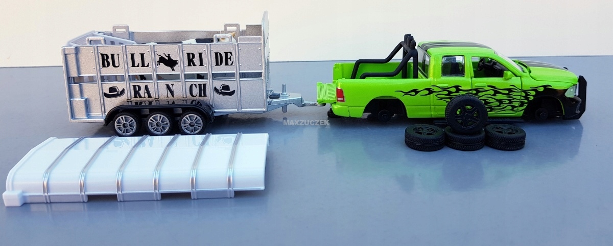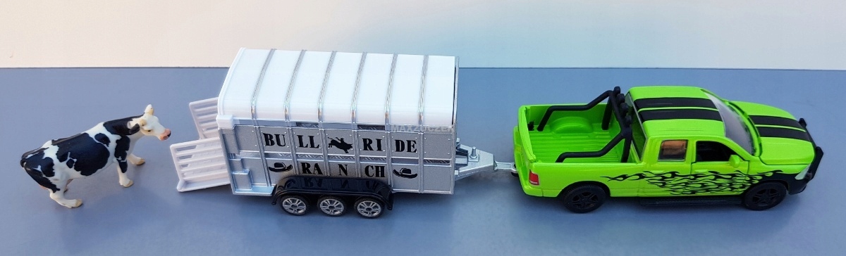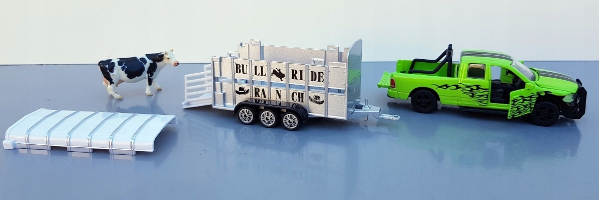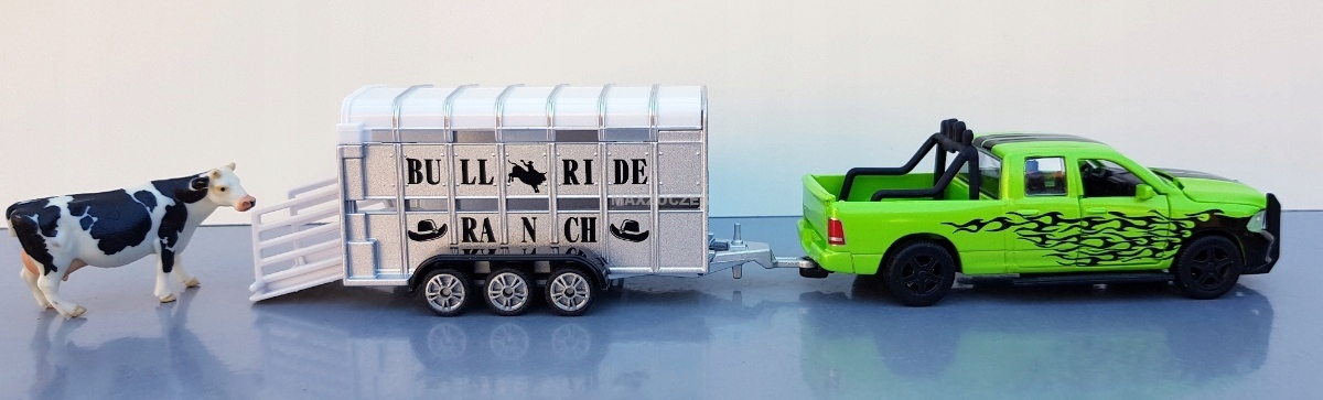 Dzięki Dodge RAM nawet najtwardsi kowboje przesiadają się chętnie na cztery koła: silniki nawet ciągnąc przyczepy z bydłem Ifor-Williams gwarantują prawidłowy napęd na zapylonych trasach i autostradach do następnej aukcji bydła. Z ochroną przed uderzeniem, pałąkiem bezpieczeństwa i światłami RAM jest solidnym urządzeniem roboczym dla kowbojów i farmerów. Pojazd ma otwierane elementy: maskę, oboje drzwi i tylną klapę platformy ładunkowej. Poza tym wymieniane koła lakierowane na czarny kolor z szerokimi oponami. Trzyosiowa przyczepa do przewozu bydła jest wykonana z metalu, a plastikowy dach można zdejmować; tylną klapę można otwierać, aby ułatwić załadunek bydła