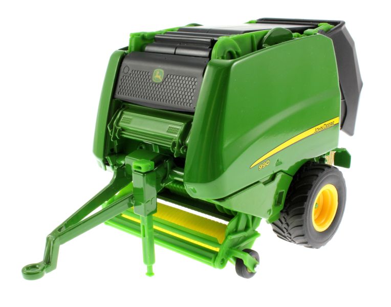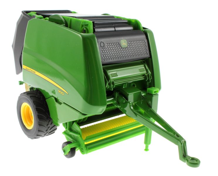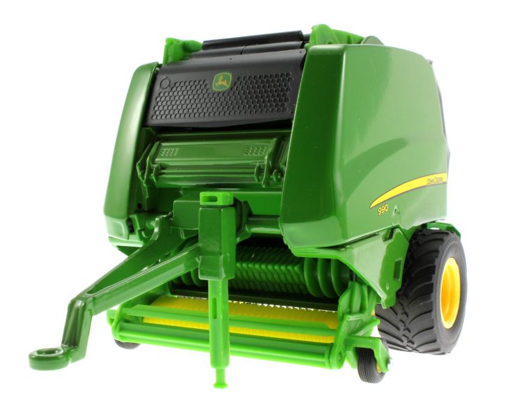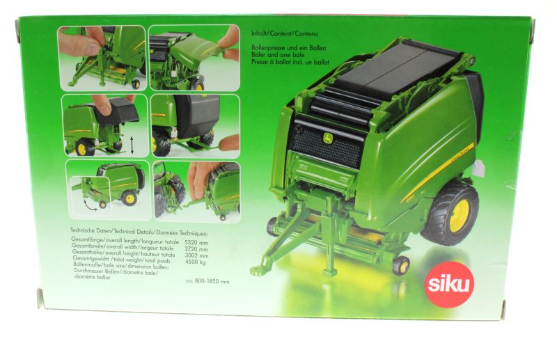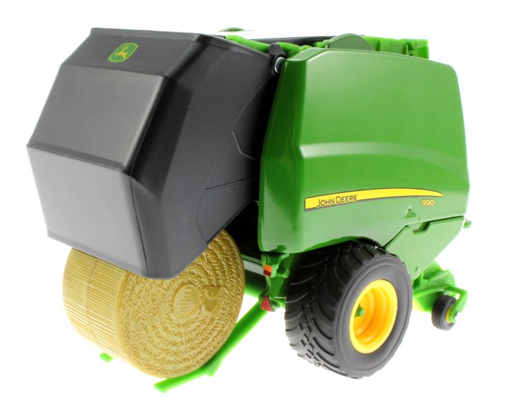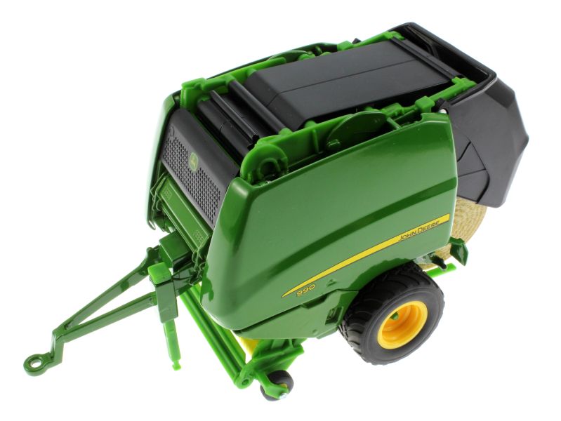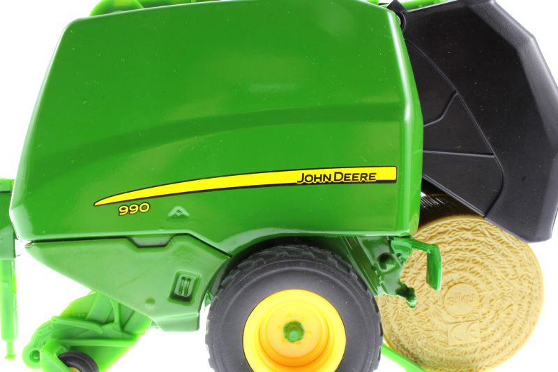 Model Siku prasy John Deere 990 ma otwieraną tylną klapę, z której spadają okrągłe bele. Zestaw zawiera dwie bele. Urządzenie zbierające pod osią jest ruchome.