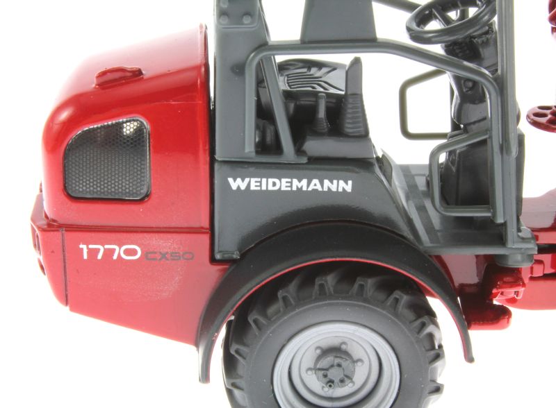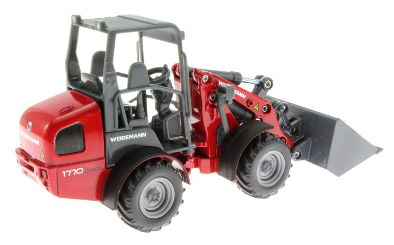 Weidemann Hoftrac firmy Siku ma ruchomą przegub na przedniej osi. Przednie ramię można przesuwać, a łyżkę można przechylać. Opony są wykonane z pełnej gumy.