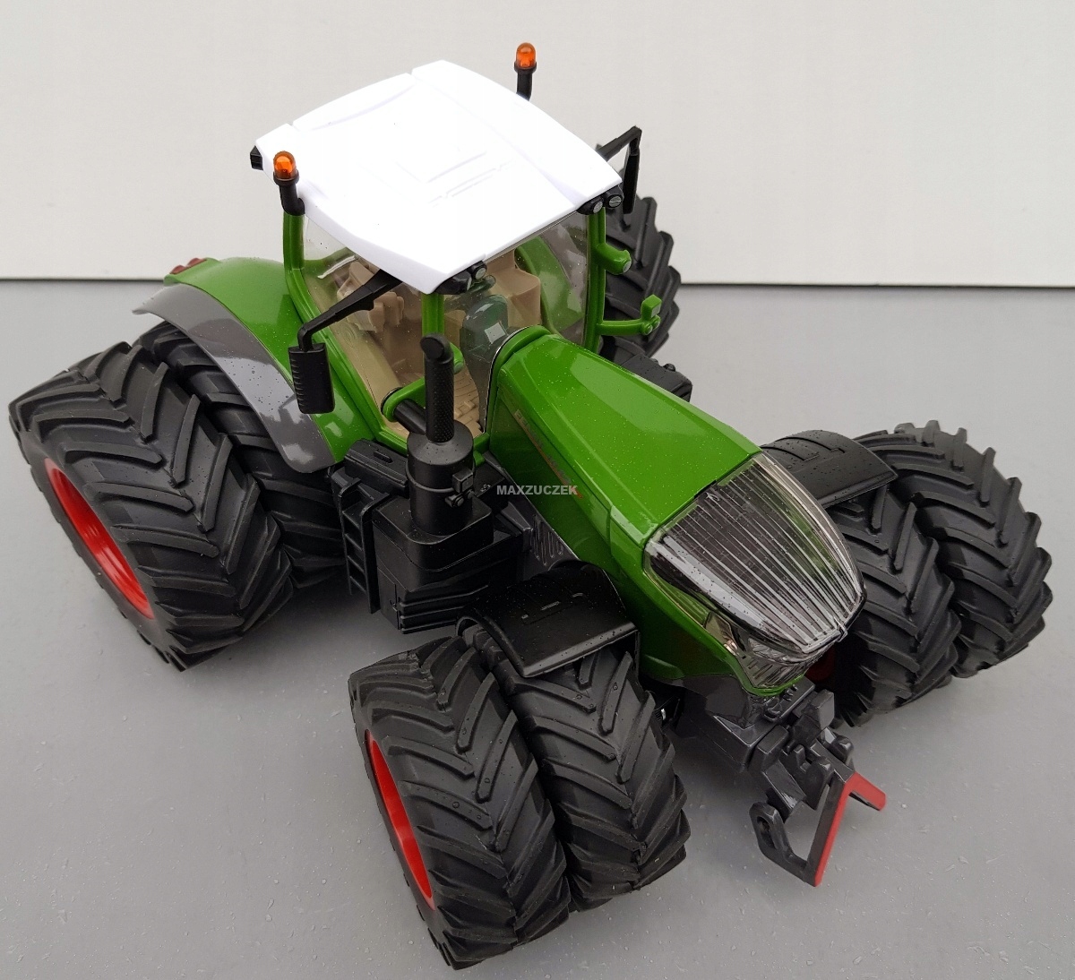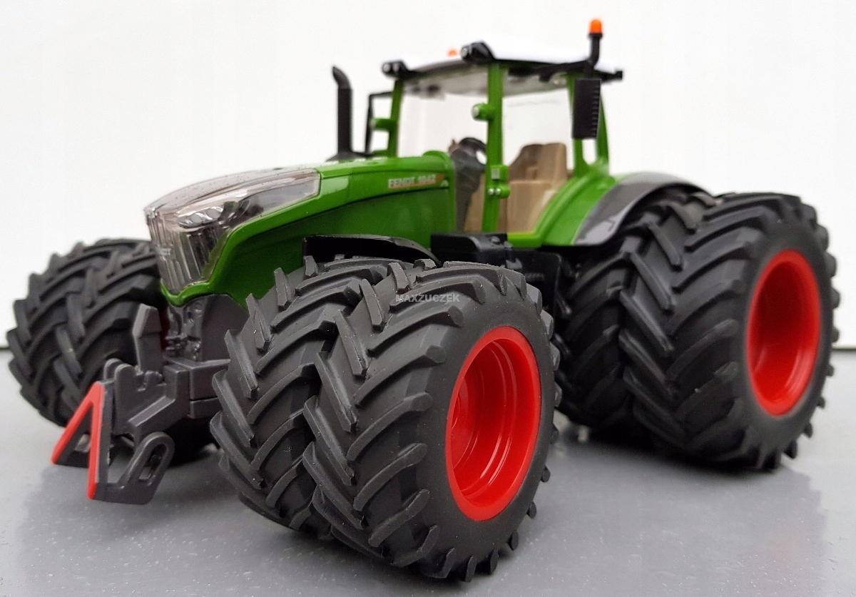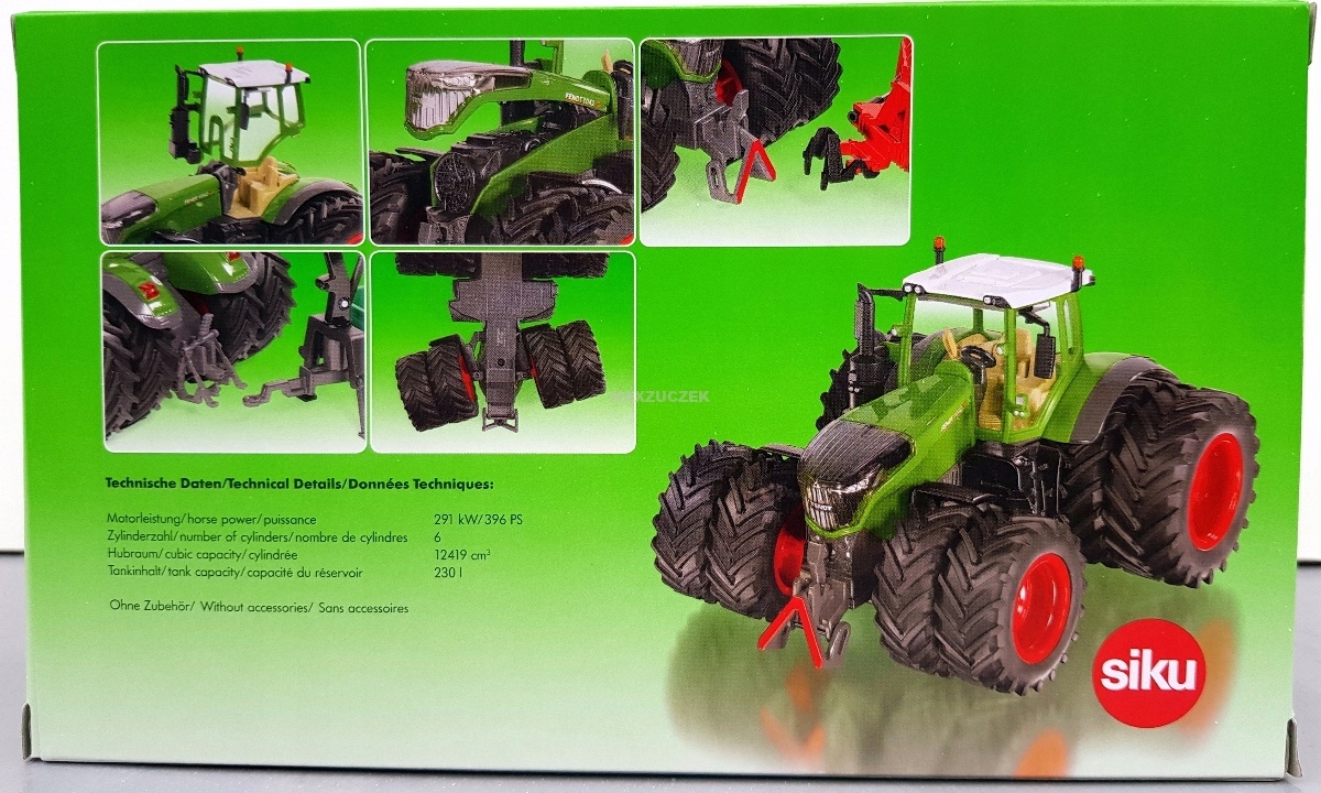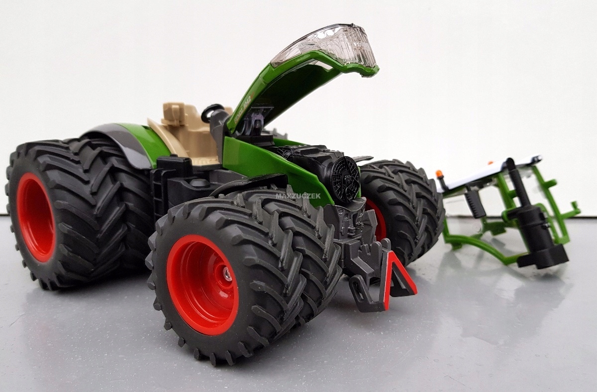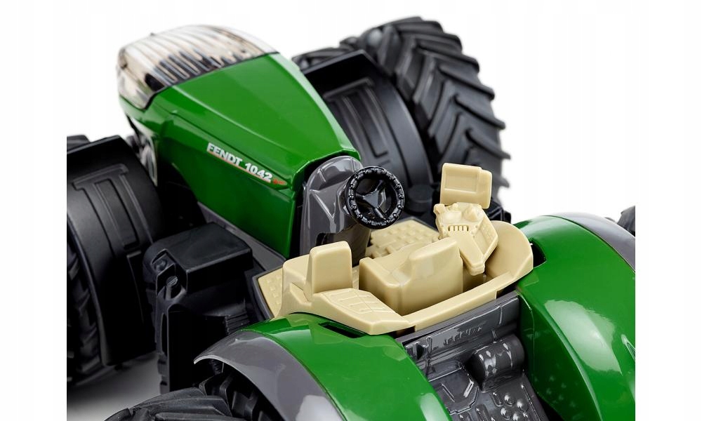 Silny, silniejszy... model Fendt z serii 10. Topowy model serii – poprzez swoją wielkość i cztery opony bliźniacze na osi przedniej i tylnej – pokazuje, jaką siłę posiada ten traktor na polu: ponad 400 koni mechanicznych i potężny moment obrotowy. Mimo to tym potężnym pojazdem w skali 1:32, wykonanym z wysokiej jakości metalu i tworzywa sztucznego, da się wygodnie kierować za pomocą ruchomej kierownicy. Precyzyjny układ kierowniczy z wahadłową osią przednią ułatwia manewrowanie po polu i na terenie gospodarstwa. Dodatkowo można z łatwością zdjąć kabinę. Zatem do pracy: przy użyciu ruchomego sprzęgła przedniego i tylnego SIKU można podłączać największe narzędzia rolnicze SIKU i ciągnąć je po polu.
