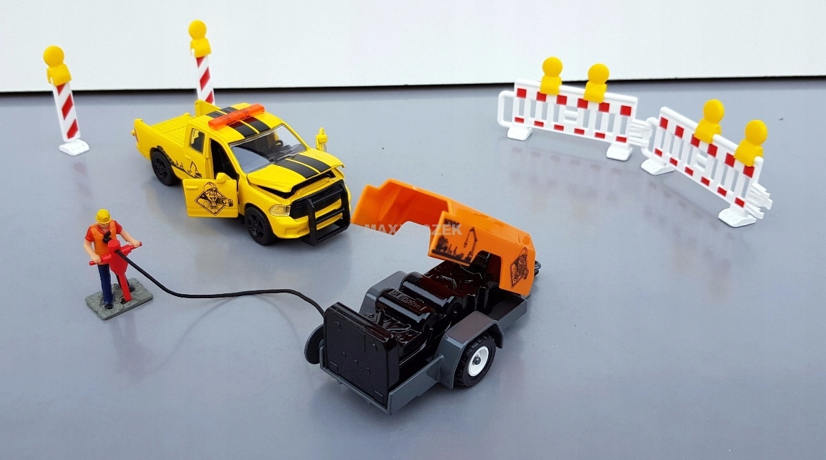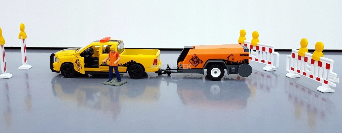 RAM 1500 to młot parowy wśród amerykańskich pickupów. Osiem cylindrów i moc wystarczająca również do pracy jako ciągnik na budowie. Pickup ma przyczepę ze sprężarką na haku. W rezultacie mobilna ekipa jest szybko dostępna na miejscu wszędzie tam, gdzie trzeba skuć nawierzchnię drogi za pomocą młota pneumatycznego. Włączyć sprężarkę, podnieść osłonę silnika sprężarki w celu zapewnienia chłodzenia, założyć kask i ochronę słuchu - i można rozpocząć pracę. Żółto-pomarańczowa kolorystyka sprawia, że ekipa budowlana jest widoczna z daleka. Bariery i słupki zawarte w zestawie zabezpieczają dodatkowo teren budowy. Z ładowarką kołową Liebherr L580 2plus2 (3533), wywrotką Wacker Neuson DW 60 (3509) i pojazdem Mercedes-Benz Atego z dźwigiem (3534) SIKU ma w swojej flocie ciężki sprzęt budowlany i pojazdy budowlane.