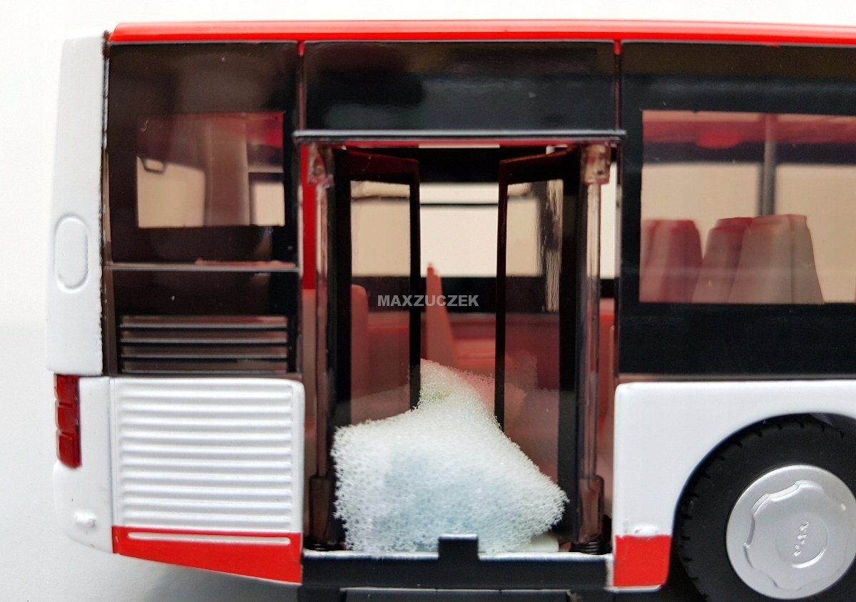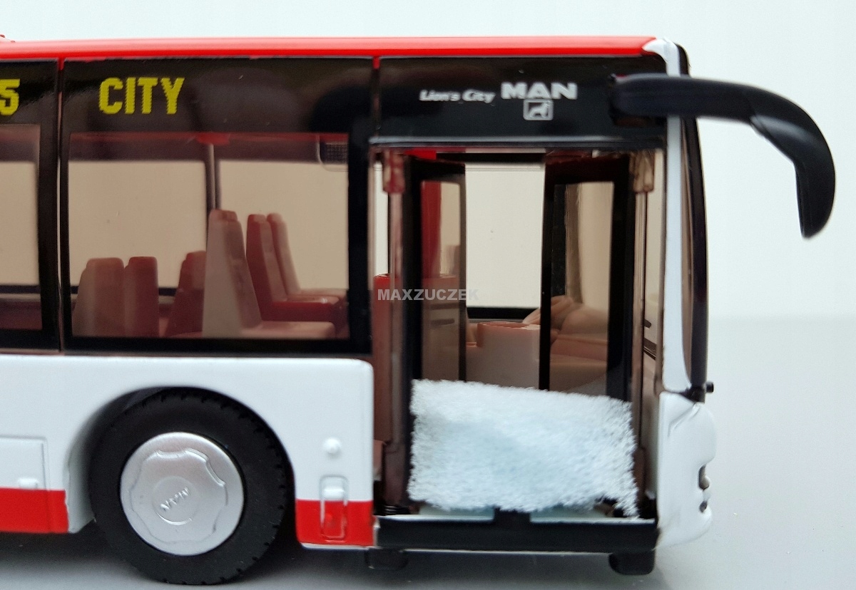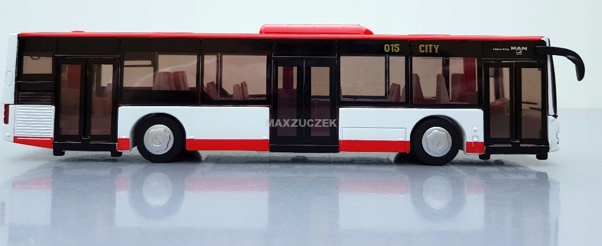 Szczegółowo odwzorowany model autobusu marki MAN w skali 1:50. Model posiada otwierane drzwi ( przednie i tylne), przyciemniane szyby oraz otwieraną pokrywę silnika.