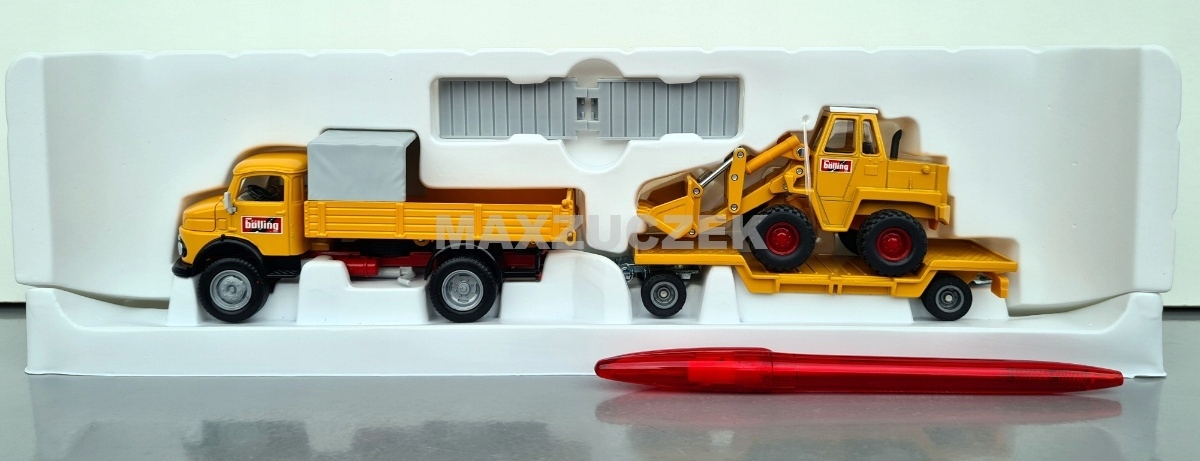 Mercedes-Benz z okrągła maską wyprodukowany w prawie milionie egzemplarzy. Niezwykle duża liczba sztuk i wyjątkowo długi czas produkcji: od 1959 do 1996 roku. Ciężarówka przewoziła towary, materiały budowlane i ziemię podczas cudu gospodarczego i nadal jeździ na całym świecie. Była twarzą wielu placów budowy w Republice Federalnej Niemiec. Charakterystyczna maska jest otwierana, a skrzynia się przechyla. Silnik wysokoprężny o mocy 100 KM ciągnie naczepę niskopodwoziową za pomocą legendarnej ładowarki Kramer Allrad 411. Żółte ładowarki kołowe przenoszą ziemię, spulchniają materiały masowe i transportują rury lub palety od lat pięćdziesiątych XX wieku. Zespół prezentuje się w historycznym wzornictwie firmy budowlanej Bölling.