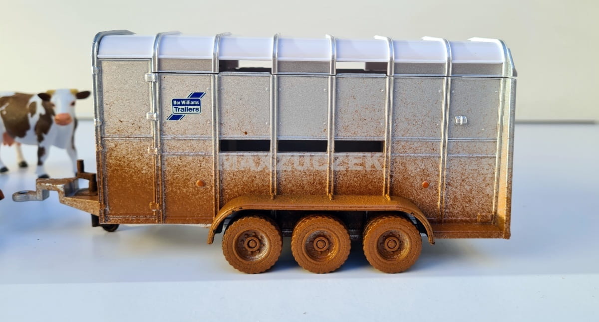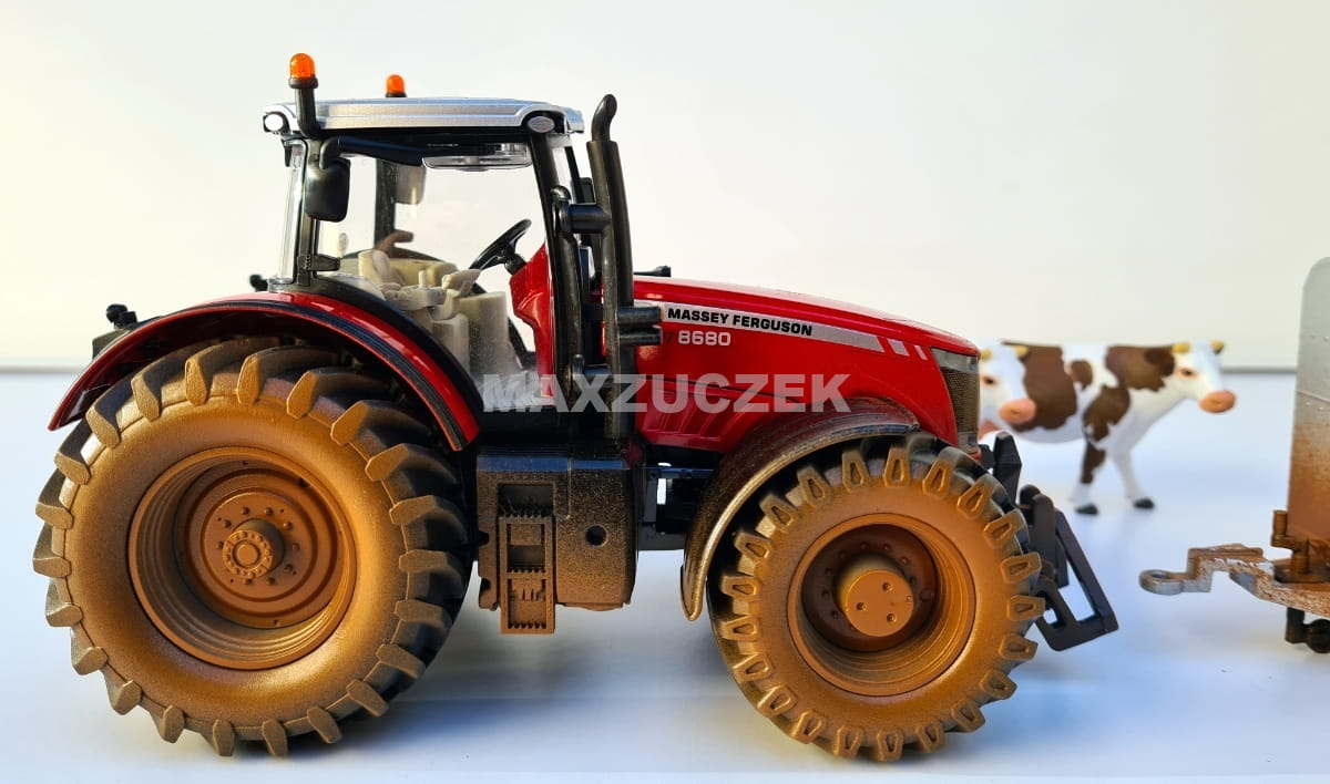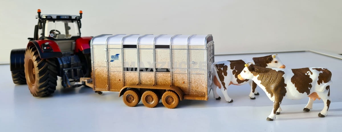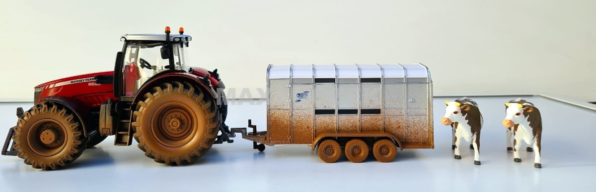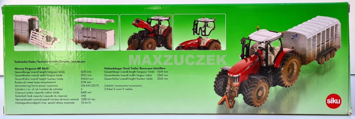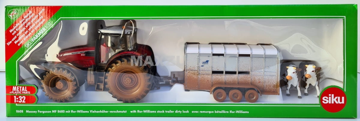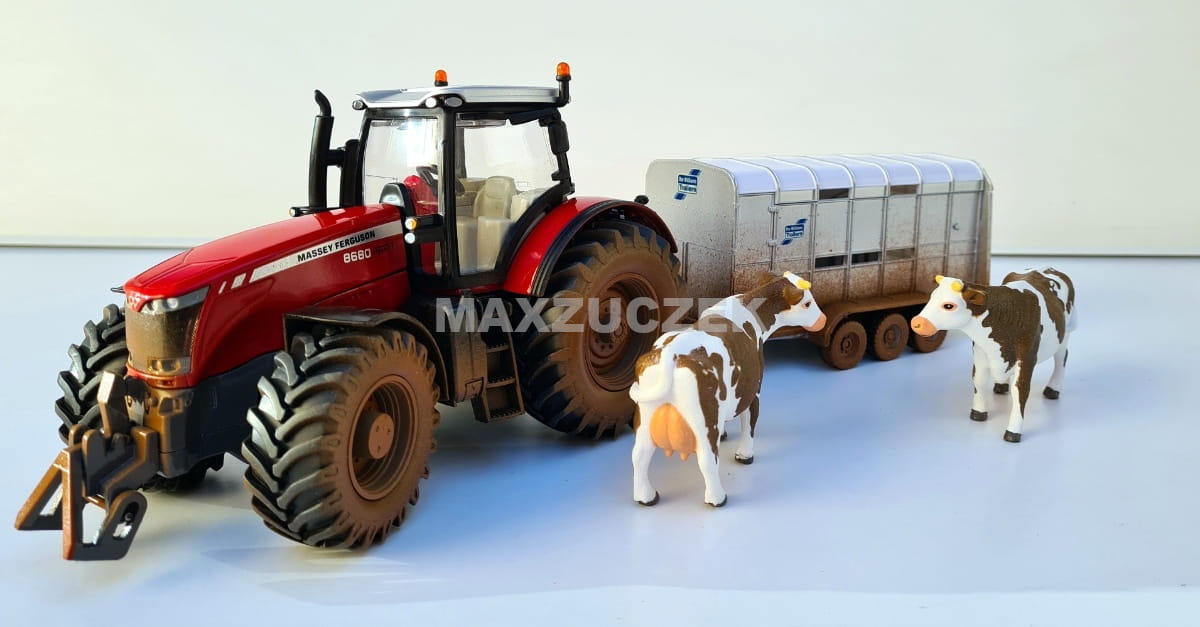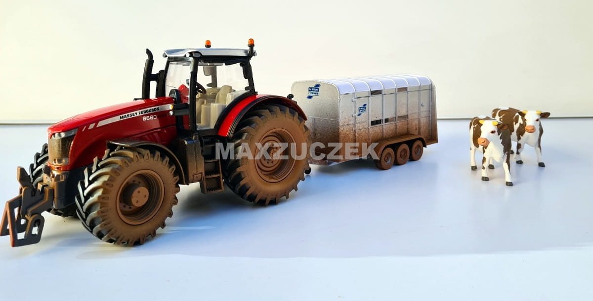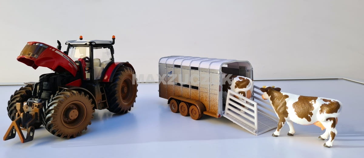 SIKU 8608 traktor Massey Ferguson 8680 z przyczepą dla zwierząt + 2 krowy (edycja ubrudzony) 1:32