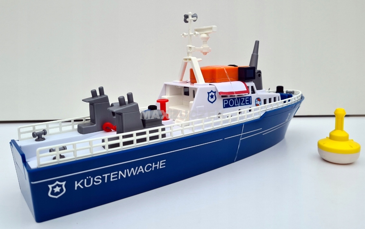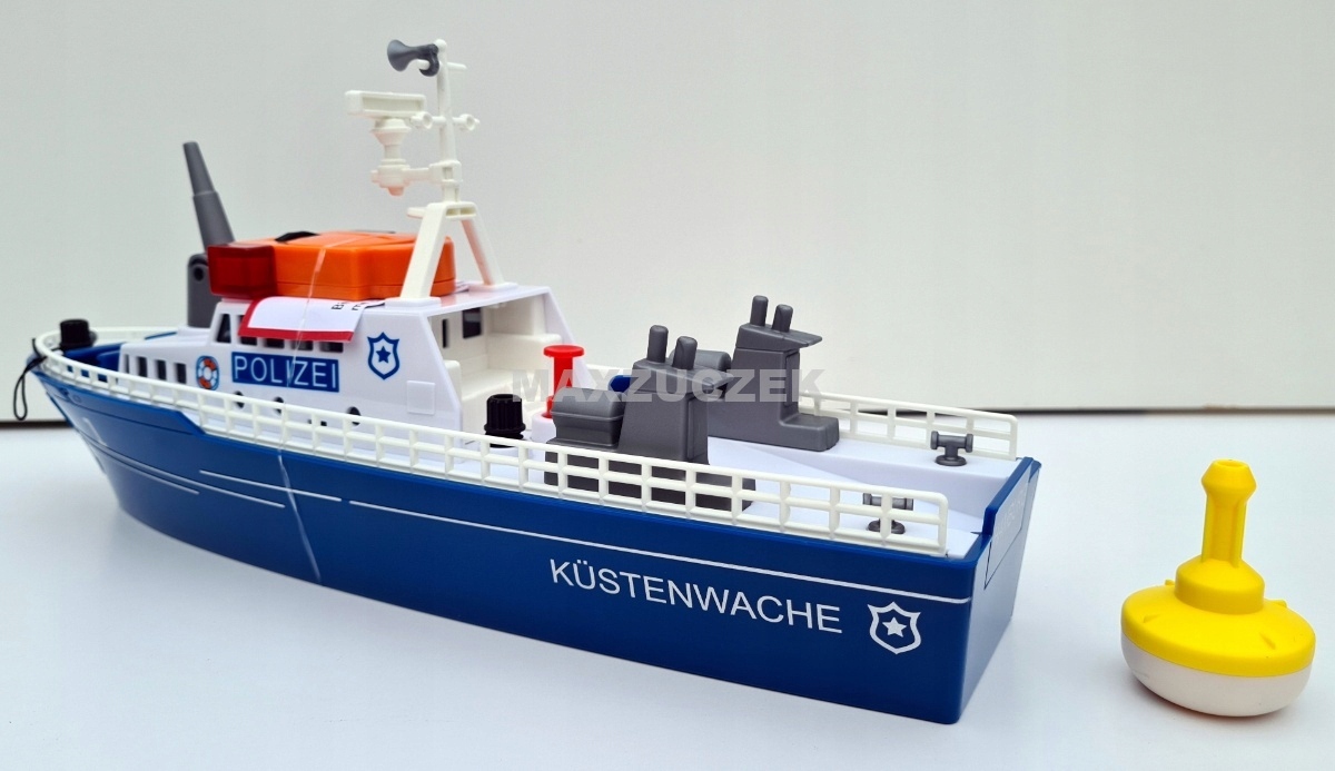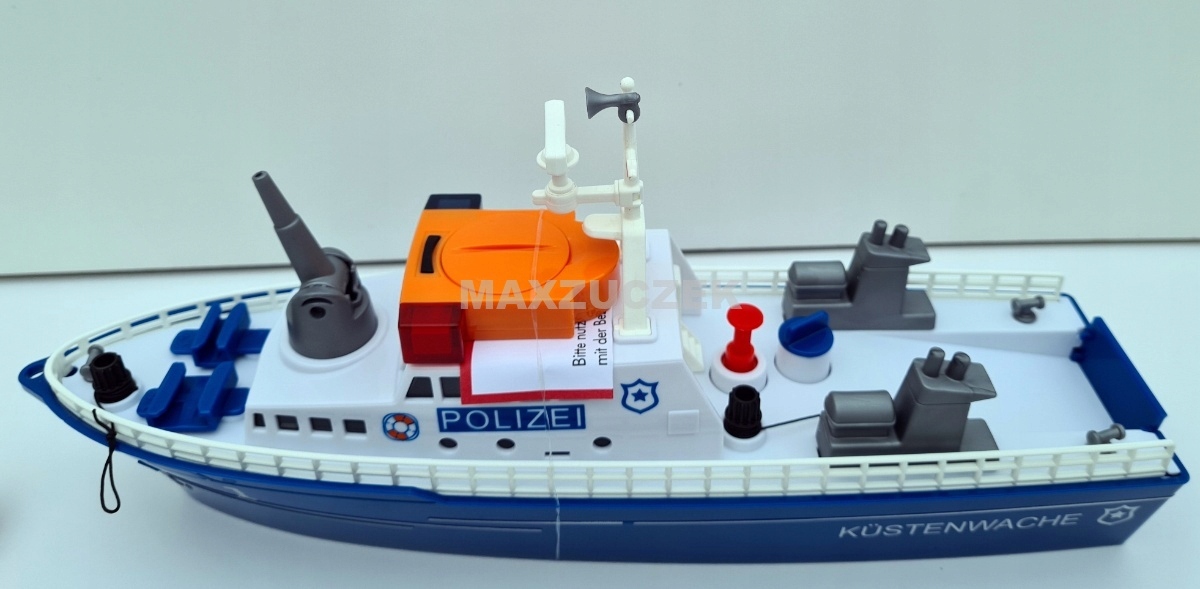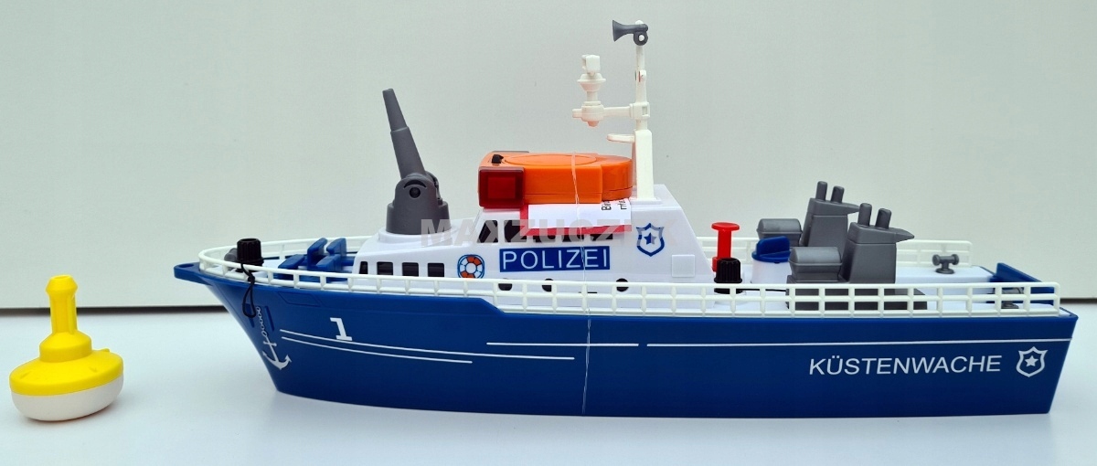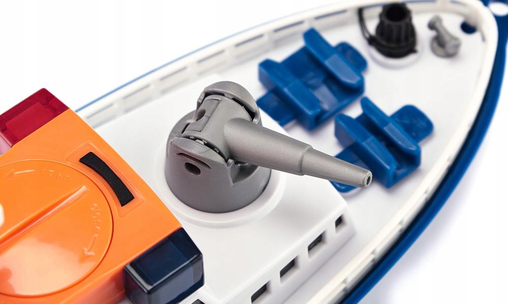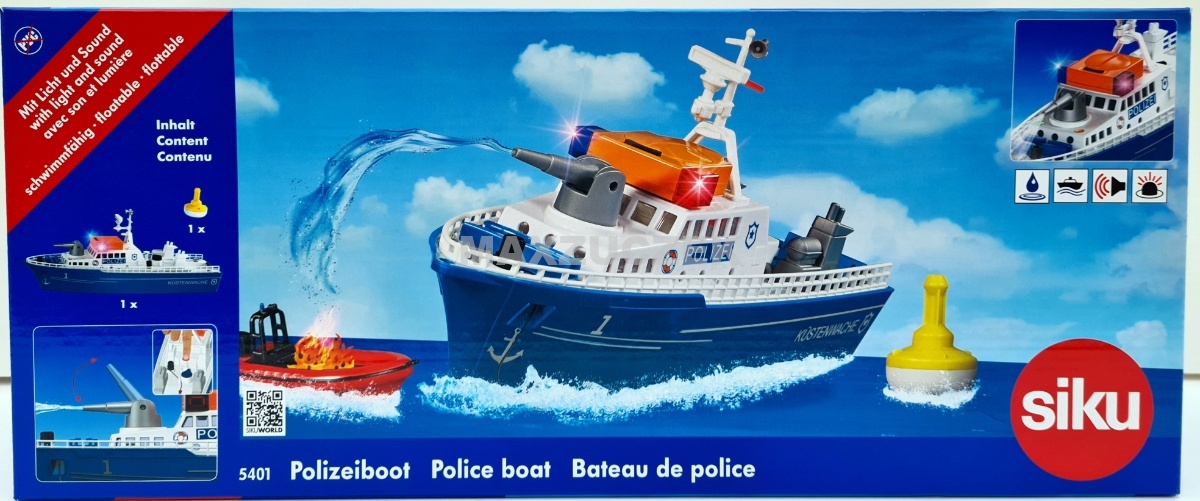 Pościg za przemytnikami na wodzie. Sprzed dziobu tryska piana. Łódź policyjna pędzi przez wodę z pełną mocą, biorąc kurs na szybką motorówkę. Policja ściga przemytników, włącza niebieskie i czerwone migające światła sygnalizacyjne LED oraz elektryczny sygnał dźwiękowy. Przemytnicy nie zatrzymują się, próbują uciec z wód terytorialnych. Jedyne, co pozostało policji, to zatrzymać łódź przemytników za pomocą armatki wodnej: woda naprzód marsz! W tym celu do armatki można wlać wodę i za pomocą korka wytworzyć ciśnienie. Łódź została trafiona armatką wodną, policjanci przyciągają ją na linie do łodzi policyjnej za pomocą wciągarki. Na rufie rozłożono klapę, a łódź jest wciągana na pokład. Zadanie wykonane: przemytnicy zostali schwytani. Nowa łódź policyjna SIKUWORLD może pływać i jest napędzana za pośrednictwem adaptera za pomocą standardowych silników innych zabawek systemowych. Jako akcesoria dostępna jest duża boja, używana wtedy, gdy łódź jest zacumowana.