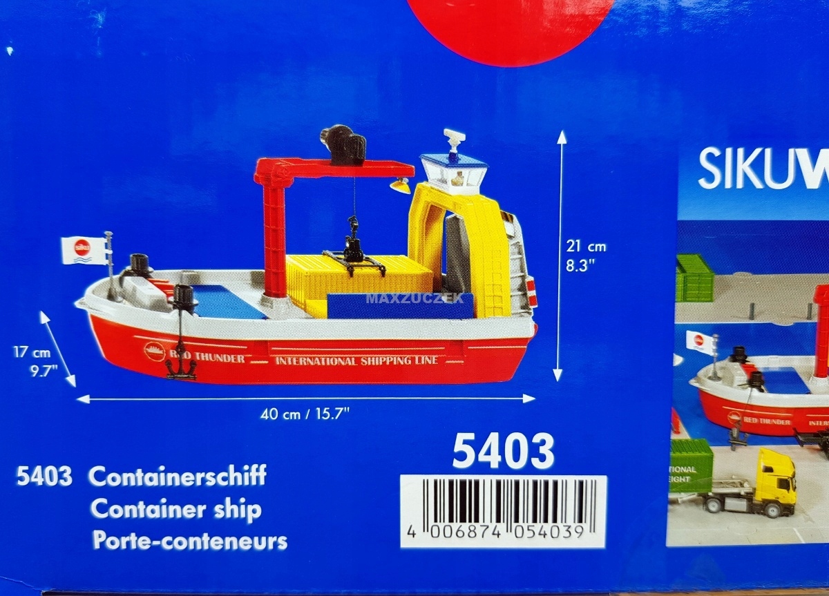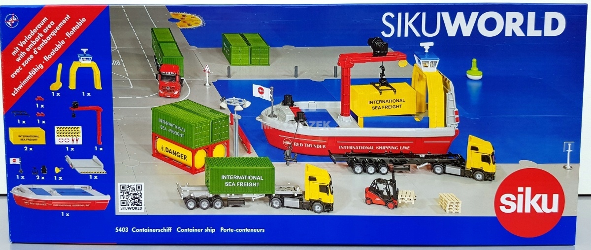 Nowy kontenerowiec poszerza świat zabawek o tematykę portową. Oceaniczne olbrzymy poruszają się po morzach świata i bezpiecznie transportują ładunki do portu docelowego w świecie SIKU WORLD. Prężny kontenerowiec cumuje w porcie za pomocą dwóch mechanicznych wind kotwicznych. Podobnie jak w przypadku wielkoformatowych pierwowzorów, dwa zbiorniki wewnątrz statku można wypełnić sypkim ładunkiem (granulatem lub piaskiem) lub dwoma kontenerami. Na pokładzie kontenerowca da się przewozić również samochody i ciężarówki. Mogą one przejechać przez rufę do obu zbiorników. Kontenery można przenosić w górę i w dół za pomocą obrotowego dźwigu i ruchomego wózka podwieszonego wyposażonego w specjalny uchwyt. Oczywiście świetnie nadadzą się one również do czekających na nabrzeżu naczep SIKU w skali 1:50. Do załadunku i rozładunku nadaje się załączona do zestawu łopata