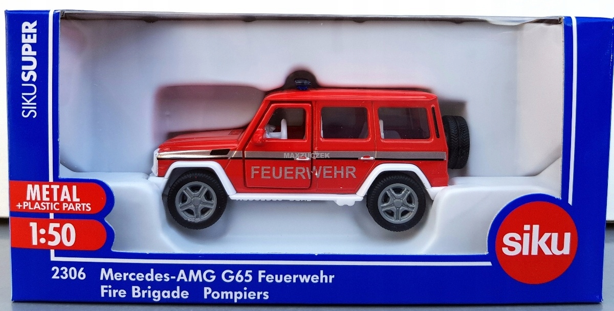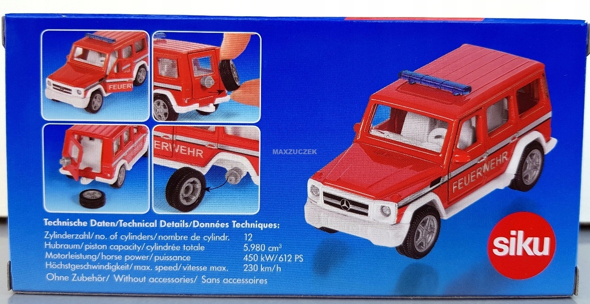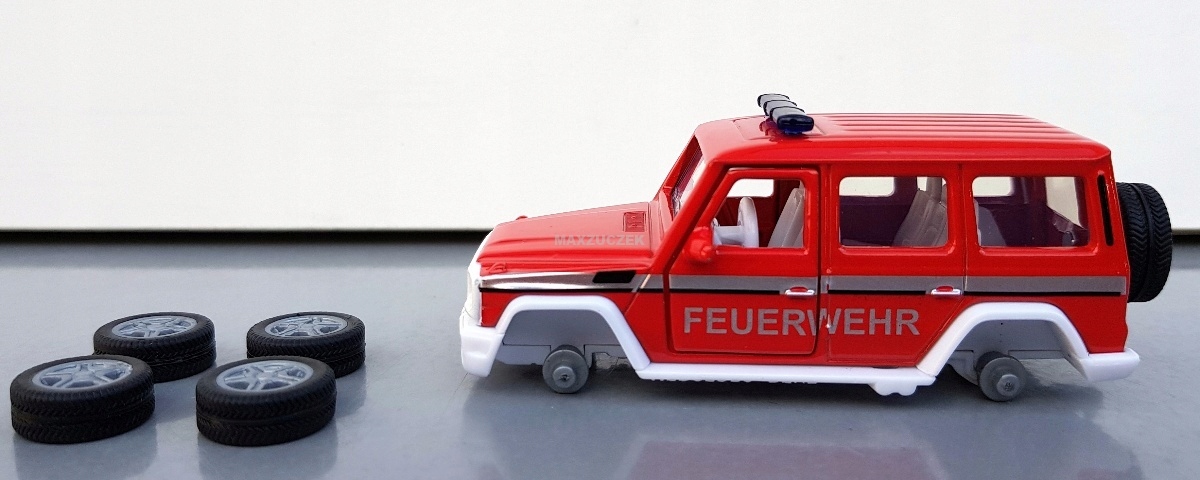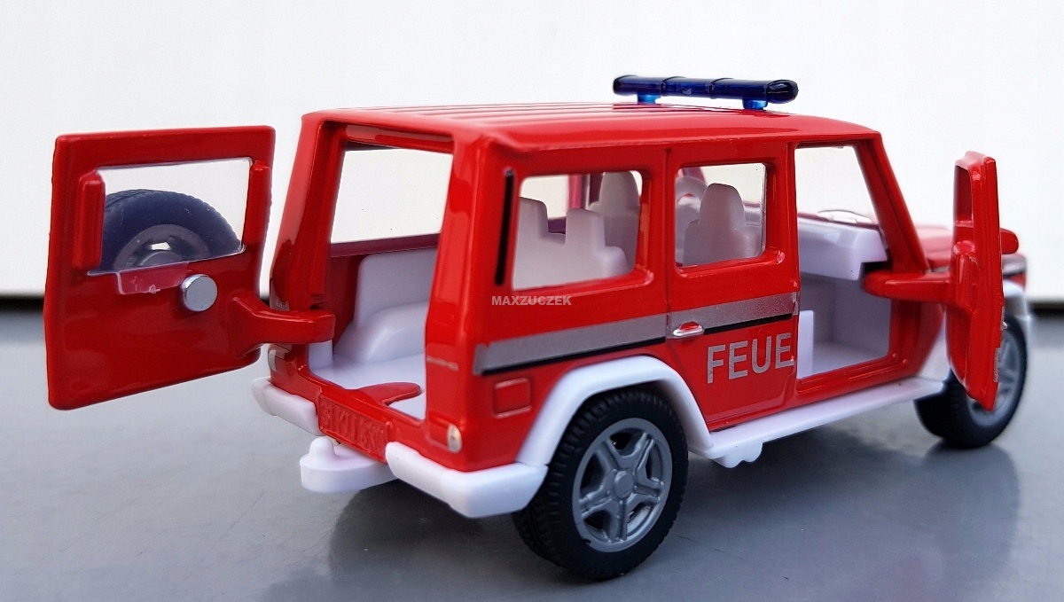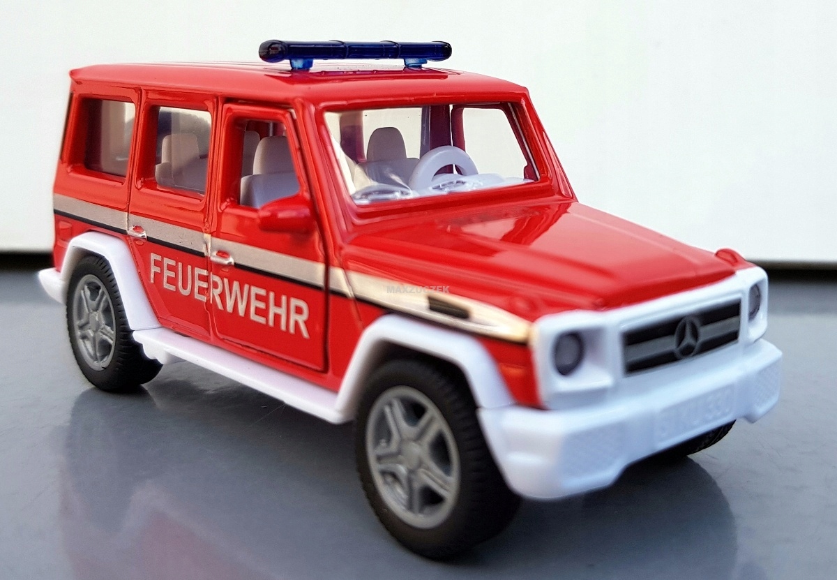 Pierwotna forma pojazdu terenowego żyje w modelu Mercedes G jeszcze 40 lat po jego wprowadzeniu. W wariancie AMG G65 z silnikiem V12 biturbo i 630 KM jest wyjątkowo mocny. Wyposażenie strażackie z kogutami na dachu nie pozowała nie zauważyć tego pojazdu nawet przy wyłączonym niebieskim świetle. Dowództwo akcji szybko dojedzie na miejsce akcji nawet w trudnym terenie. Miniatura w skali 1:50 ma otwierane przednie i tylne drzwi oraz wymienne wszystkie cztery koła i zapasowe koło. Zaczep umożliwia ciągnięcie nawet ciężkich ładunków.