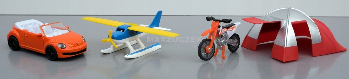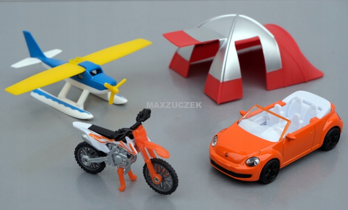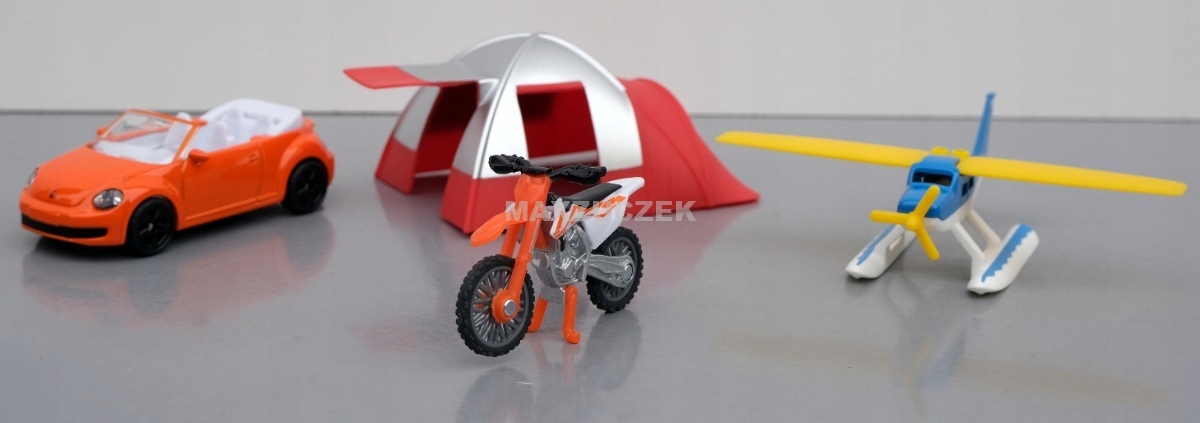 Przyjemne spędzanie wolnego czasu dla wszystkich. Na wielkim jeziorze zawsze coś się dzieje. Przy brzegu stoi pomarańczowy kabriolet obok dużego namiotu z baldachimem. Gdy wodnosamolot wystartuje, za rogiem pojawia się warkoczący motocykl crossowy. Zestaw rekreacyjny Siku tworzy własny świat zabawy. Zestaw zawiera wodnosamolot ze składanymi skrzydłami, motocykl crossowy KTM z oponami o grubym profilu, stojak i ruchomą kierownicę oraz kabriolet