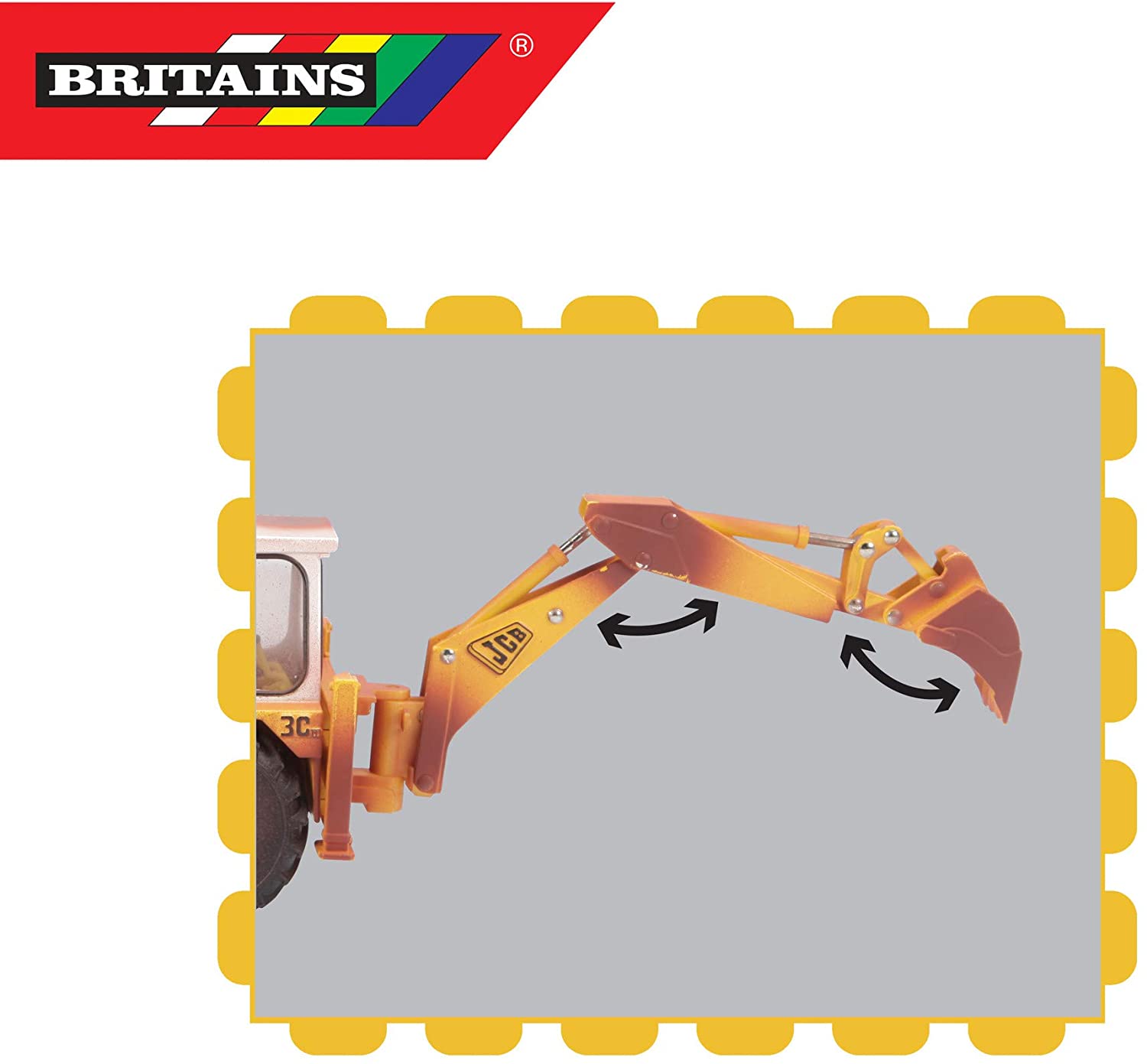 Model wykonany jest z elementów metalowych i plastikowych. Jest wyposażony w gumowe opony z bieżnikiem zaś jego elementy ruchome odpowiadają możliwościom prawdziwego pojazdu. Posiada również hydrauliczne mechanizmy za pomocą których reguluje się ustawienie przedniej jak i tylnej łyżki. Posiada również aktywny układ kierowniczy. Tylne ramię rozkłada i obraca się na boki do 180 stopni, tak jak w prawdziwym pojeździe natomiast przednia łyżka unosi się w górę. Koparka charakteryzuje się wysoką jakością wykonania i znaczącym odwzorowaniem oryginału widocznym w detalach. Model może świetnie współpracować z innymi pojazdami z serii Britains w tej samej skali.